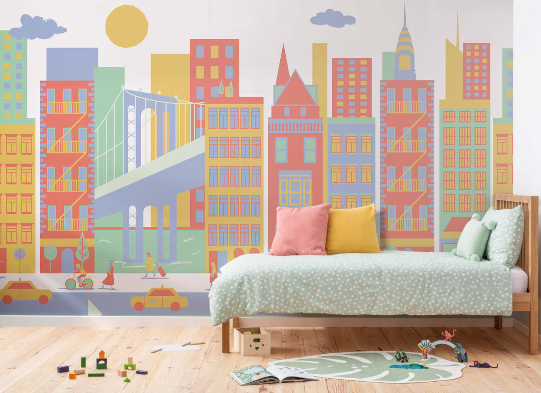 Mural Hovia New York CH0022MU03W przedstawia zjawiskową, dziecięcą interpretację tętniącej życiem panoramy metropolii. Architektoniczna mozaika wieżowców, mostów i kultowych symboli Nowego Jorku została ukazana w formie graficznej opowieści o miejskiej przygodzie – wypełnionej pastelowymi kolorami i energią codziennego ruchu. Kompozycja wzbogacona została o detale takie jak żółte taksówki, przechodnie, rowerzyści czy żaglówki na rzece, co tworzy wrażenie dynamicznej scenerii. Model Hovia CH0022MU03W New York emanuje optymizmem, zachęca do odkrywania świata i inspiruje dziecięcą wyobraźnię. Zbalansowana paleta barw: łososiowe czerwienie, miętowe zielenie, cytrynowe żółcie i pudrowe błękity zapewnia efektowny, ale jednocześnie przyjazny wizualnie akcent. Mural idealnie współgra z jasnymi meblami i tekstyliami w stylu skandynawskim, przekształcając pokój dziecięcy w kreatywną przestrzeń pełną życia.