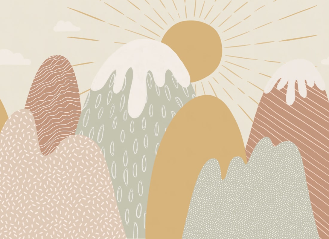 Mural Hovia Snow Top CH0238PA04W przedstawia krajobraz złożony z miękkich, zaokrąglonych gór pokrytych śniegiem uzupełniony o stylizowane słońce rozświetlające przestrzeń ciepłymi promieniami. Kompozycja utrzymana w odcieniach terakoty, beżu, szałwii i pudrowego różu wpisuje się w nowoczesną paletę barw typową dla stylu boho i skandynawskiego. Rysunkowe linie, zróżnicowane faktury oraz nieregularne desenie wzmacniają poczucie przytulności i czynią wzór interesującym wizualnie. Mural Hovia CH0238PA04W Snow Top harmonizuje z jasnym drewnem, naturalnymi tekstyliami oraz pastelowymi dodatkami. To projekt idealny do dziecięcej sypialni, w której liczy się spokojna atmosfera i estetyczne zakotwiczenie w naturze.