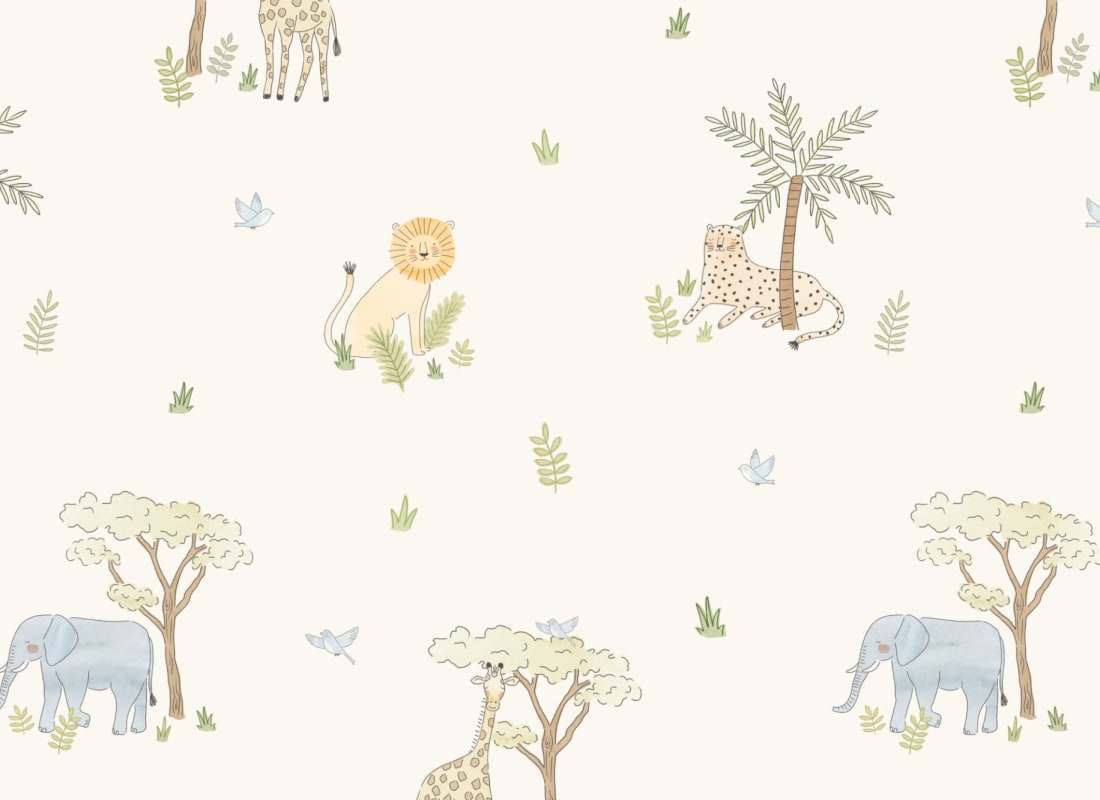 Tapeta Hovia Little Safari CH5099MU07R przedstawia subtelny, ręcznie ilustrowany krajobraz sawanny, w którym pojawiają się żyrafy, słonie, gepardy i lwy otoczone bujną roślinnością. Każda postać wyróżnia się miękką paletą barw, idealnie dopasowaną do kremowego tła. Mural Hovia CH5099MU07R Little Safari zachwyca delikatnością detali i spokojem kompozycji, tworzy kojące tło w dziecięcych przestrzeniach. Pastelowe kolory, lekka kreska i neutralna kolorystyka wspierają estetykę nowoczesnych pokojów dziecięcych, szczególnie tych urządzonych w stylu skandynawskim lub boho. Dekoracja wprowadzi do pokoju dziecięcego lub kącika zabaw wrażenie harmonii i przytulności, a jednocześnie pobudzi ciekawość dziecka, inspirując do odkrywania świata. Wzór jest ponadczasowy, dzięki czemu rośnie razem z dzieckiem, wpisując się w potrzeby zarówno niemowląt, jak i przedszkolaków.