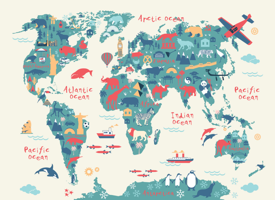 Hovia WM0043BG04W Explore - mural dla dzieci w mapę świata i zwierzęta