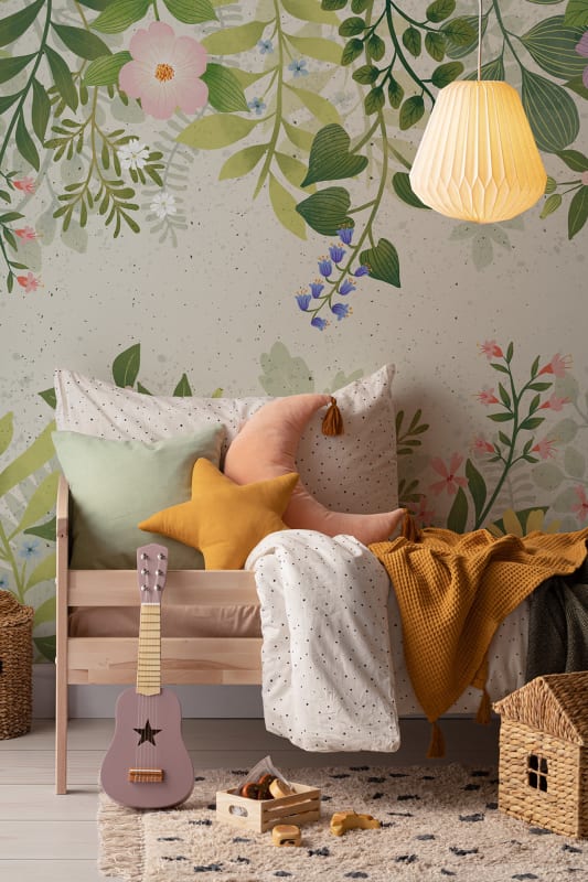 Mural Hovia Secret Garden FL0135MU07W przedstawia gęsto zaaranżowaną kompozycję florystyczną inspirowaną estetyką dziecięcych ilustracji i ogrodów w stylu cottage. Wzór został opracowany ręcznie – z widocznymi śladami akwareli, kredek i tuszu – co nadaje mu ilustracyjnego charakteru. W górnej i dolnej partii dekoracji dominuje bujna roślinność: liście, łodygi, dzikie kwiaty i pnącza, które wypełniają przestrzeń energetyczną, ale nieprzytłaczającą grafiką. Tło utrzymane w jasnym, neutralnym tonie równoważy kolorystykę, dzięki czemu model dobrze odnajduje się we wnętrzach scandi-boho i nowoczesnych. Mural Hovia FL0135MU07W Secret Garden ożywi sypialnię, pokój dziecięcy lub salon, wprowadzając atmosferę beztroskiej świeżości i kontaktu z naturą.