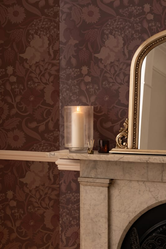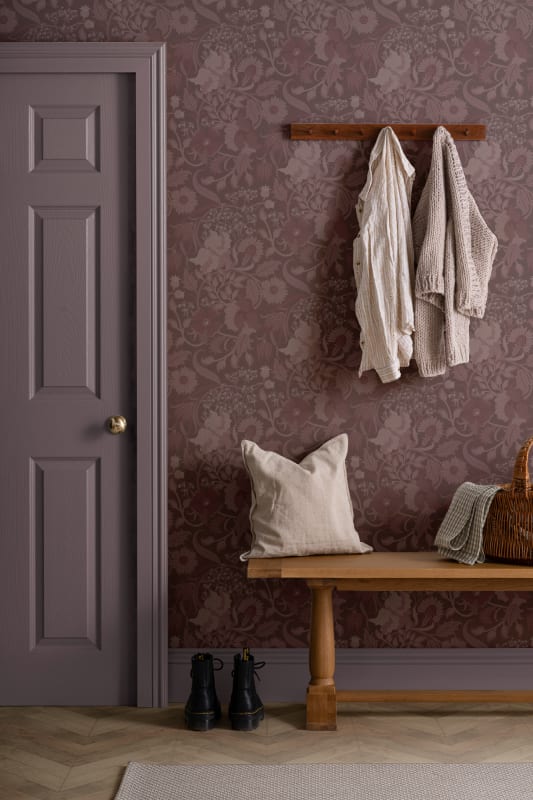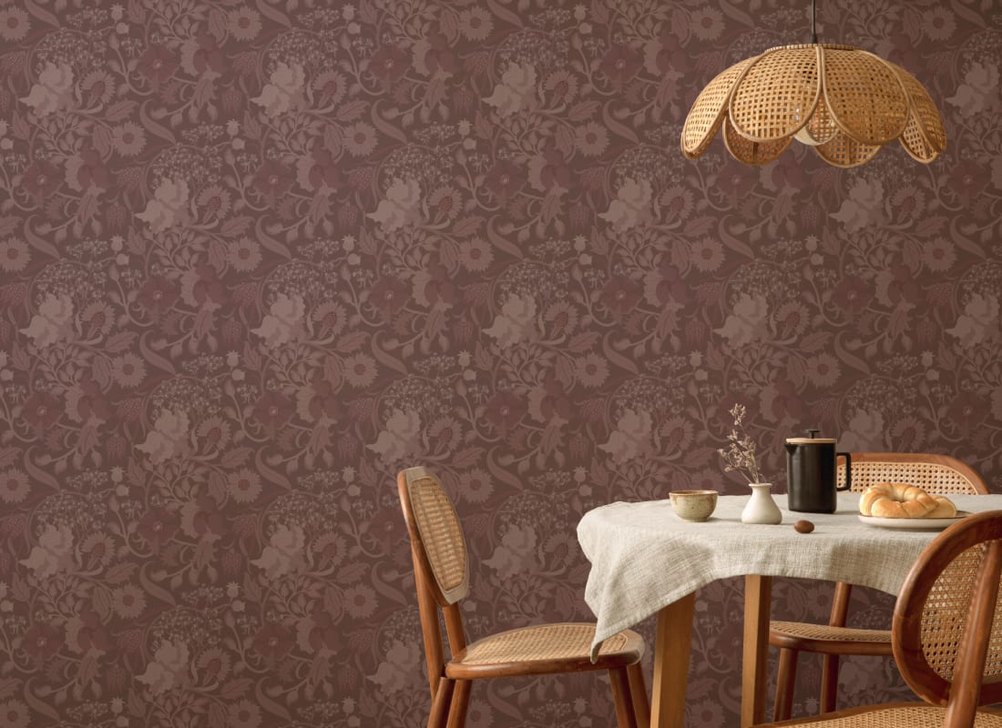 Tapeta Hovia Tansy Plum FL5457PU03R prezentuje klasyczny, ornamentalny wzór inspirowany historycznymi tekstyliami, który opiera się na detalicznych przedstawieniach kwiatów maku, ostu, baldachimów pietruszki i dzikich ziół. Ciemnofioletowe tło w odcieniu dojrzałej śliwki podkreśla reliefowo zarysowany motyw roślinny, tworząc efekt głębi oraz bogatego zdobienia. Tapeta Hovia FL5457PU03R Tansy Plum doskonale odnajduje się w przestrzeniach wymagających wyrazistego tła – w jadalniach, salonach lub sypialniach z elementami klasycznego lub rustykalnego wystroju. Kolorystyka emanuje ciepłem i elegancją, a powtarzalność wzoru zapewnia spójność kompozycji na dużych powierzchniach. Do każdego miejsca wniesie atmosferę wyrafinowanego spokoju, jednocześnie nadając pomieszczeniu dekoracyjnej wartości i charakteru.
