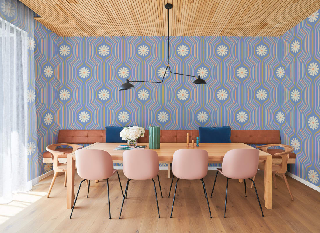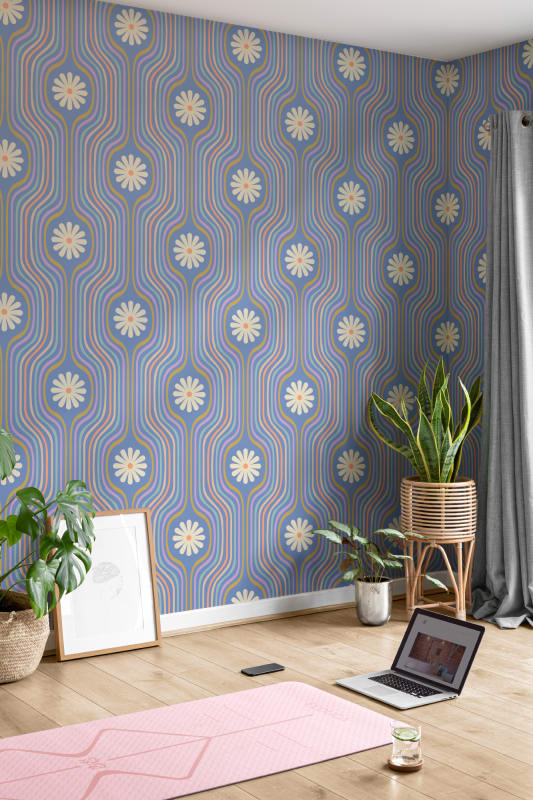 Tapeta Hovia Joyride Purple FL5702PU11R prezentuje złożoną kompozycje inspirowaną estetyką lat 60., wzbogaconą o nowoczesną klarowność formy. Zakrzywione, równoległe linie tworzą wizualną falę, która prowadzi wzrok pionowo, porządkując przestrzeń i jednocześnie nadając jej pulsującej dynamiki. Stylizowane stokrotki rozmieszczone w stałych odstępach wprowadzają florystyczny kontrapunkt do geometrycznej kompozycji, wzmacniając wrażenie rytmicznej harmonii. Wzór bazuje na precyzyjnie dobranych proporcjach i symetrii, dzięki czemu nie traci przejrzystości mimo intensywności układu. Idealnie zrównoważona paleta kolorystyczna podkreśla kontrasty i eksponuje graficzny charakter dekoracji. Tapeta Hovia FL5702PU11R Joyride Purple wprowadzi do wnętrza wyrazisty klimat retro z nutą nowoczesnej lekkości, sprawdzając się w aranżacjach o artystycznym, odważnym charakterze.