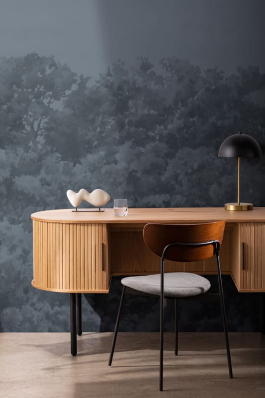 Mural Hovia Buttonwood Navy FO0114BU07W przedstawia sylwetki gęsto ułożonych koron drzew zbudowanych z ciemnych, nasyconych odcieni granatu. Akwarelowe wykończenie wzoru łagodzi intensywność koloru i tworzy efekt półmroku, który kojarzy się z nocnym pejzażem leśnym. Taka kompozycja pozwala wprowadzić do wnętrza atmosferę wyciszenia i naturalnej elegancji. Dekoracja Hovia FO0114BU07W Buttonwood Navy wpisuje się w estetykę nowoczesnych, stonowanych przestrzeni. Dobrze prezentuje się z jasnym drewnem, miękkimi tkaninami i minimalistycznymi formami. Mural najlepiej prezentuje się w sypialniach lub salonach, gdzie podkreśli relaksujący charakter wnętrza i nada mu dekoracyjnej głębi. Projekt bazuje na subtelnym kontraście światła i cienia, dzięki czemu struktura wzoru pozostaje czytelna, ale nienachalna. Mural Hovia FO0114BU07W Buttonwood Navy łączy dekoracyjność z funkcjonalnością, tworząc estetyczne tło dla współczesnego stylu życia.