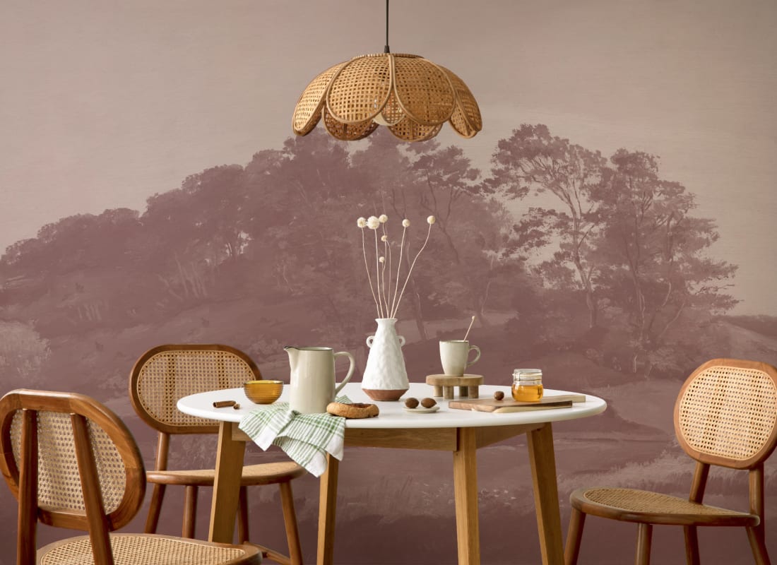 Mural Hovia Sørupvang Hills Pink FO0376PI04W przedstawia klasyczny pejzaż inspirowany twórczością Johana Thomasa Lundbye zinterpretowany w nowoczesnej palecie pudrowych róży i ciepłych beży. Kompozycja bazuje na malarskiej fakturze i płynnych przejściach tonalnych, co nadaje całości wrażenia głębi oraz organicznej miękkości. Dekoracja zyskuje charakter harmonijnego tła, które nie przytłacza, lecz buduje przyjazne wizualnie otoczenie. Mural Hovia FO0376PI04W Sørupvang Hills Pink dobrze komponuje się z aranżacjami w stylu japandi, organic modern oraz nowoczesnym. Sprawdzi się zarówno w jadalni, jak i salonie, gdzie subtelnie ociepli przestrzeń, równocześnie wprowadzając element sztuki krajobrazowej. Dzięki stonowanej kolorystyce wzór wspiera budowanie spokojnej atmosfery i doskonale koresponduje z naturalnymi materiałami, takimi jak drewno, len czy rattan.