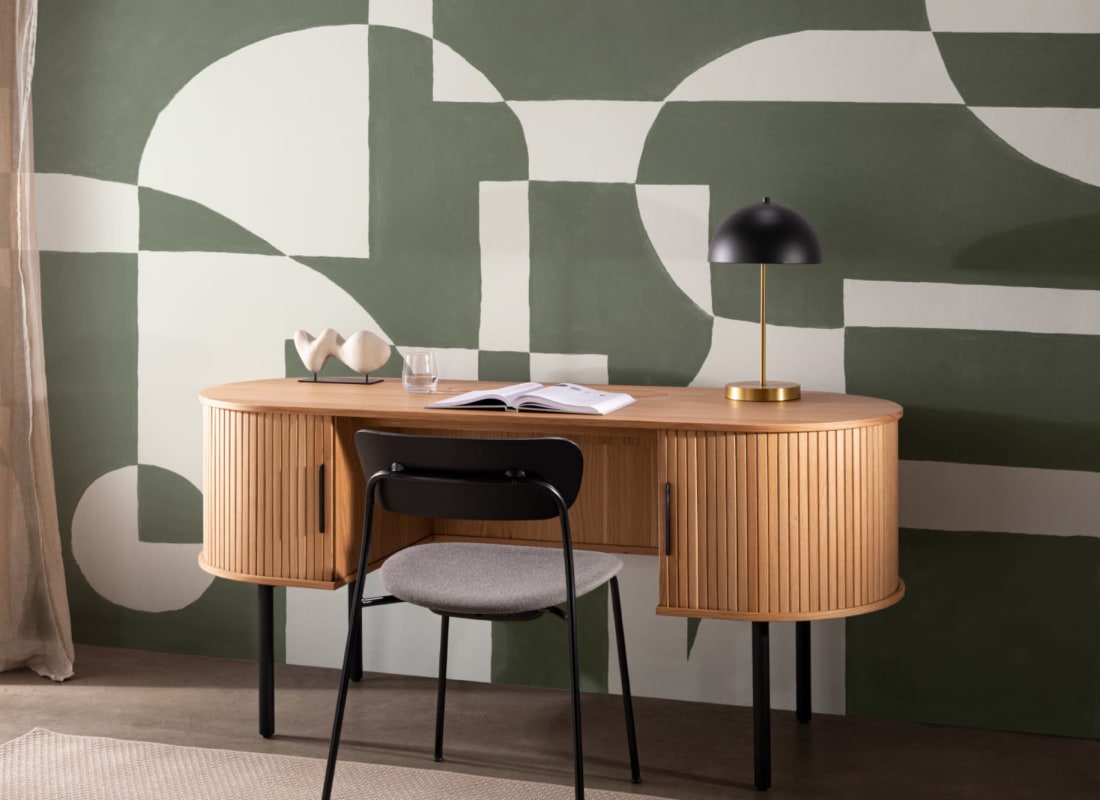 Mural Hovia Hulanicki Green GE0171GR04W opiera się na zestawieniu ciemnej, chłodnej zieleni z kremowym tłem, tworząc czytelną, rytmiczną kompozycję zbudowaną z graficznych podziałów i uproszczonych kształtów. Geometryczny układ o miękko zaokrąglonych formach bazuje na ręcznie malowanym rysunku – widać w nim nieregularność krawędzi i fakturę przypominającą powierzchnię pędzla. Model Hovia GE0171GR04W Hulanicki Green prezentuje wyważony balans między dekoracyjnym wzorem a tłem, co pozwala na zastosowanie go zarówno w większych, jak i mniejszych przestrzeniach. Odcień zieleni dobrze współgra z naturalnymi materiałami – drewnem, lnianymi tekstyliami czy czarnymi, matowymi detalami. Dekoracja wprowadzi do wnętrza spokojną strukturę, graficzną dyscyplinę oraz kolorystyczną głębię w nowoczesnym, nieprzeładowanym wydaniu.