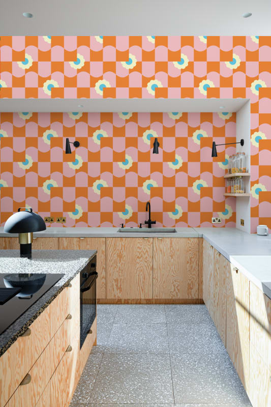 Tapeta Hovia Petal Pop Pink GE5707OR11R emanuje energią i optymizmem, łącząc kwiatowy motyw z geometryczną strukturą w duchu lat 70. Rytmiczny układ falistych pasów tworzy dynamiczną kompozycję, która ożywia wnętrze i nadaje mu graficznego wyrazu. Przemyślane zestawienie kontrastowych barw – od intensywnego pomarańczu, po słodki róż – podkreśla organiczne formy stylizowanych stokrotek, rozmieszczonych nieregularnie, co dodaje całości lekkości i swobody. Wzór zachowuje doskonałą równowagę między powtarzalnością a zaskoczeniem, dzięki czemu świetnie sprawdza się zarówno na jednej ścianie, jak i jako pełne wykończeniu pomieszczenia. Tapeta Hovia GE5707OR11R Petal Pop Pink wprowadzi atmosferę beztroski i wyrazistej radości, idealnie pasując do wnętrz eklektycznych, przestrzeni kreatywnych oraz aranżacji inspirowanych estetyką vintage i pop-art.