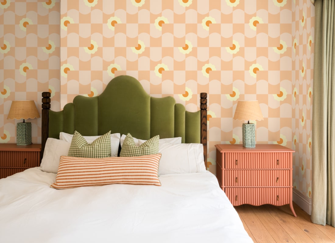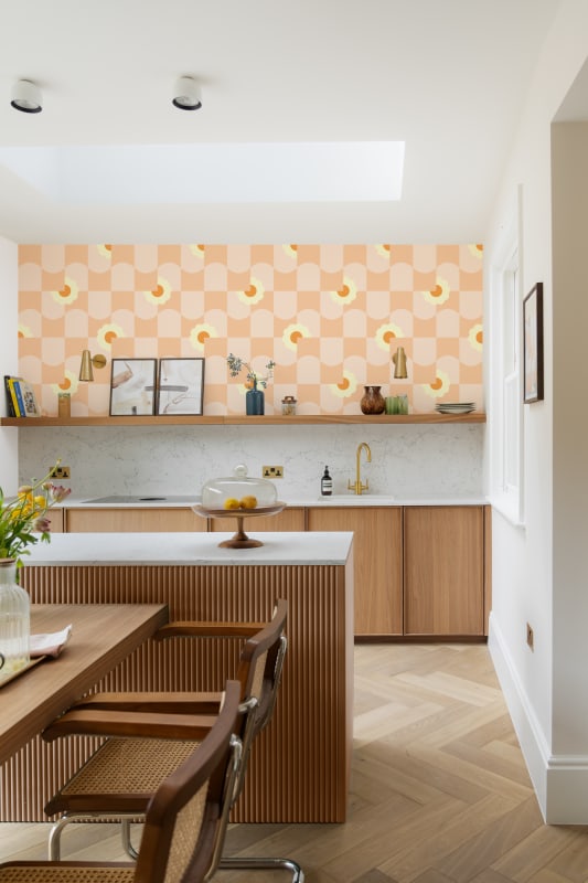 Tapeta Hovia Petal Pop Peach GE5709PI11R przedstawia graficzne połączenie geometrycznej struktury z rytmicznie rozmieszczonymi motywami kwiatowymi. Zakrzywiona siatka w stylu vintage nadaje wzorowi miękkości i dynamiki, tworząc efekt przestrzenności i subtelnego ruchu. Stylizowane stokrotki wprowadzają organiczny kontrapunkt do uporządkowanej kompozycji, nadając jej wizualnej lekkości i architektonicznej finezji. Każdy element wzoru pracuje na wspólny efekt – harmonię między estetyką retro a nowoczesną prostotą. Doskonale dobrane kolory potęgują poczucie spójności i wizualnego komfortu, a jednocześnie czynią wzór wyrazistym, ale i nieprzytłaczającym. Tapeta Hovia GE5709PI11R Petal Pop Peach wniesie do wnętrza świeżość, lekkość oraz swobodny charakter, który sprzyja kreatywnym aranżacjom inspirowanym stylem lat 70., japandi lub nowoczesnym minimalizmem z graficznym akcentem.