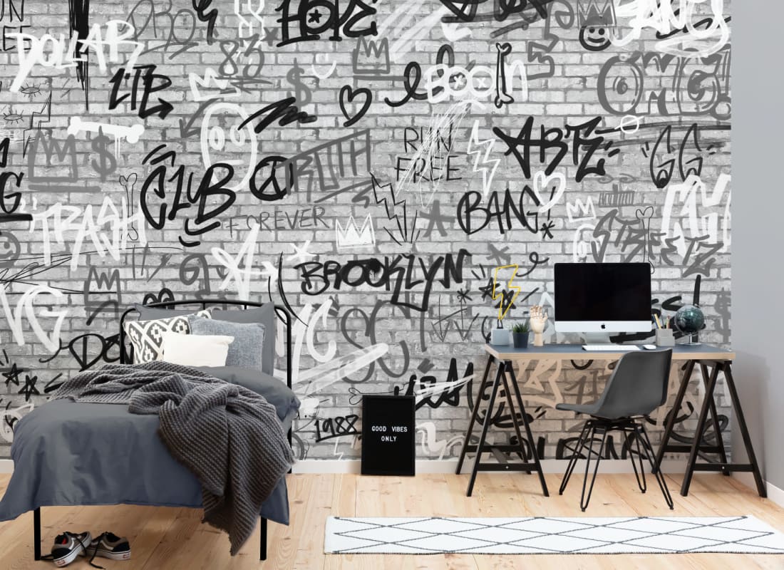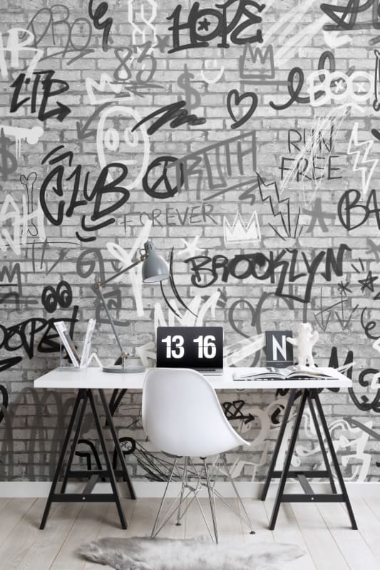 Mural Hovia Queens GR0036BG03W przedstawia graffiti naniesione na ceglaną fakturę. Dekoracja imituje strukturę klasycznej, szarej ściany z surowej cegły, na której pojawiają się dynamiczne napisy, symbole i rysunki inspirowane nowojorską sceną street artu. Czarno-biała paleta kolorystyczna wzmacnia kontrast i podkreśla charakterystyczną surowość projektu. Ten model dobrze odnajduje się w aranżacjach młodzieżowych, pokojach gier, kreatywnych biurach oraz nowoczesnych przestrzeniach mieszkalnych. Wzór dobrze komponuje się z prostymi, industrialnymi meblami, stalą oraz bielą, tworząc balans między energią grafitti a uporządkowaną geometrią wnętrza. Mural Hovia GR0036BG03W Queens nada pomieszczeniom miejskiego charakteru, wzmocni indywidualny styl i stworzy tło, które przyciąga uwagę i wzbudza emocje.