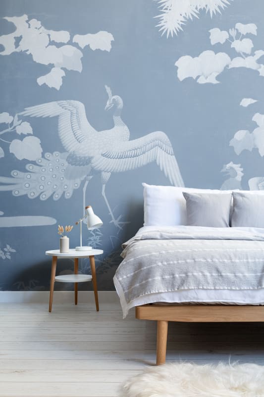 Mural Hovia Kujaku Blue JA0386BU03W emanuje spokojem i klasycznym pięknem, osadzonym w estetyce japońskiego malarstwa okresu Edo. Harmonijna kompozycja przedstawia pawie zanurzone wśród miękko zarysowanych liści, gałęzi i bambusów. Stonowany błękit działa kojąco na zmysły i nadaje dekoracji subtelnej lekkości i przestrzenności. Model Hovia JA0386BU03W Kujaku Blue wprowadza do wnętrza atmosferę kontemplacji i ciszy, idealnie współgrając z naturalnymi fakturami, jasnym drewnem oraz minimalistycznym wyposażeniem. Doskonale odnajduje się w przestrzeniach do odpoczynku – sypialni, salonie lub bibliotece. Precyzyjnie dopracowane detale i wyrafinowana forma wzoru przywodzą na myśl sztukę mistrzów tuszu i papieru. Mural pełni funkcję nie tylko dekoracyjną, ale także narracyjną – staje się opowieścią o harmonii między człowiekiem a przyrodą.