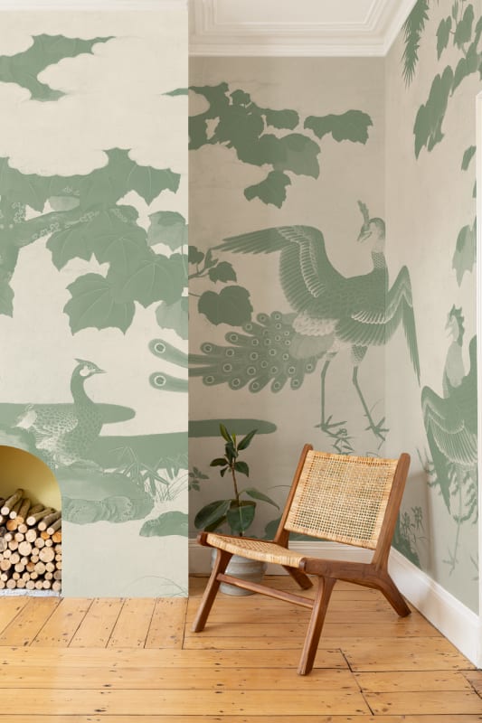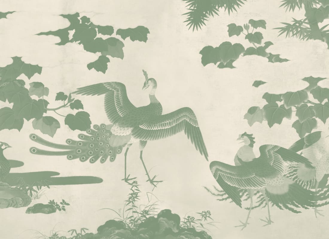 Hovia JA0387GR03W Kujaku Teal - mural w ptaki w japońskim stylu