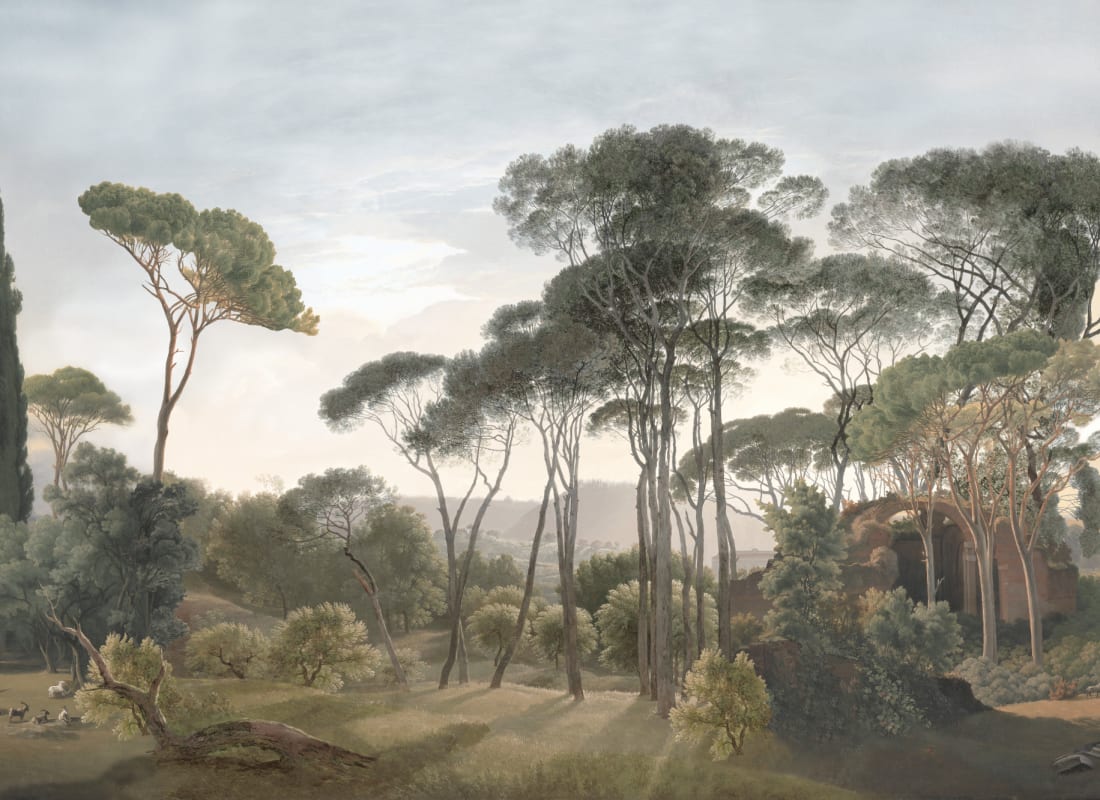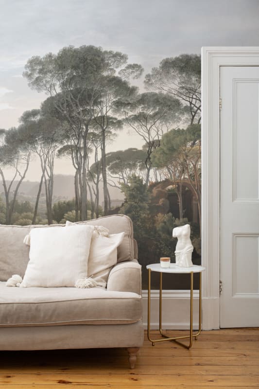 Mural Hovia Tivoli Classic LA0377GR03W prezentuje malarską interpretację śródziemnomorskiego pejzażu, gdzie monumentalne cyprysy wznoszą się nad łagodnymi wzgórzami. Tło w postaci delikatnie zamglonego nieba w tonacji rozbielonego błękitu wprowadza wizualną głębię i nostalgiczny nastrój. Detale architektoniczne w postaci porośniętych ruin wtapiają się subtelnie w zieleń, przywołując skojarzenia z klasycznym malarstwem pejzażowym epoki romantyzmu. Dekoracja oparta na realistycznej kompozycji i harmonijnych proporcjach podkreśla wyrafinowany charakter wnętrz inspirowanych historią, sztuką i naturalnym spokojem włoskich ogrodów. Mural Hovia LA0377GR03W Tivoli Classic doskonale uzupełni eleganckie przestrzenie salonu, biblioteki lub jadalni, kreując ponadczasową atmosferę kontemplacji i estetycznego ukojenia.