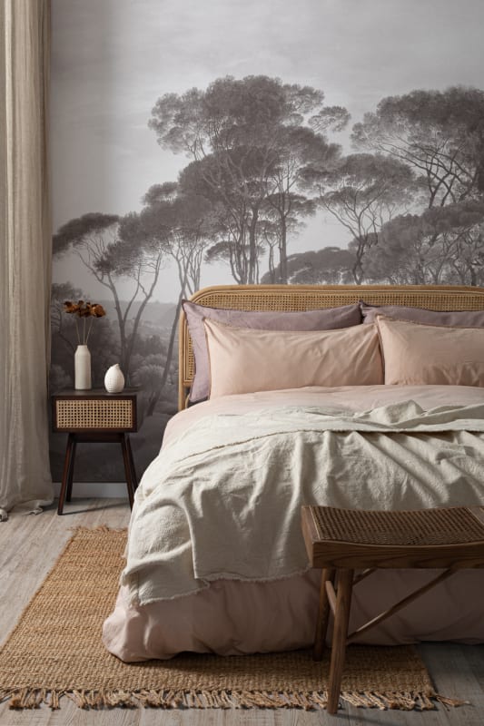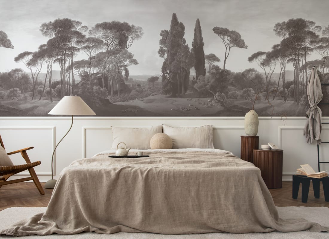 Mural Hovia LA0381GE03W Tivoli Grey wprowadza wyciszoną elegancję inspirowaną klasycznym pejzażem malarskim, w którym monumentalne cyprysy i smukłe sosny osadzone są w rozległej scenerii śródziemnomorskiej doliny. Utrzymany w spójnej palecie chłodnych szarości, model prezentuje kompozycję o malarskiej głębi i szlachetnej tonalności, która perfekcyjnie odnajduje się w aranżacjach minimalistycznych, japandi, modern classic czy contemporary. Dekoracja Hovia Tivoli Grey LA0381GE03W nada wnętrzu dystyngowanego charakteru, nie przytłaczając przy tym przestrzeni. Wzór oparty na XIX-wiecznym malarstwie krajobrazowym, z delikatną grą światłocienia i realistyczną perspektywą, wydobywa wizualną harmonię, wprowadzając poczucie ciszy i kontemplacji. To ponadczasowa forma sztuki użytkowej, która stanie się integralną częścią wystroju, a nie jedynie tłem.
