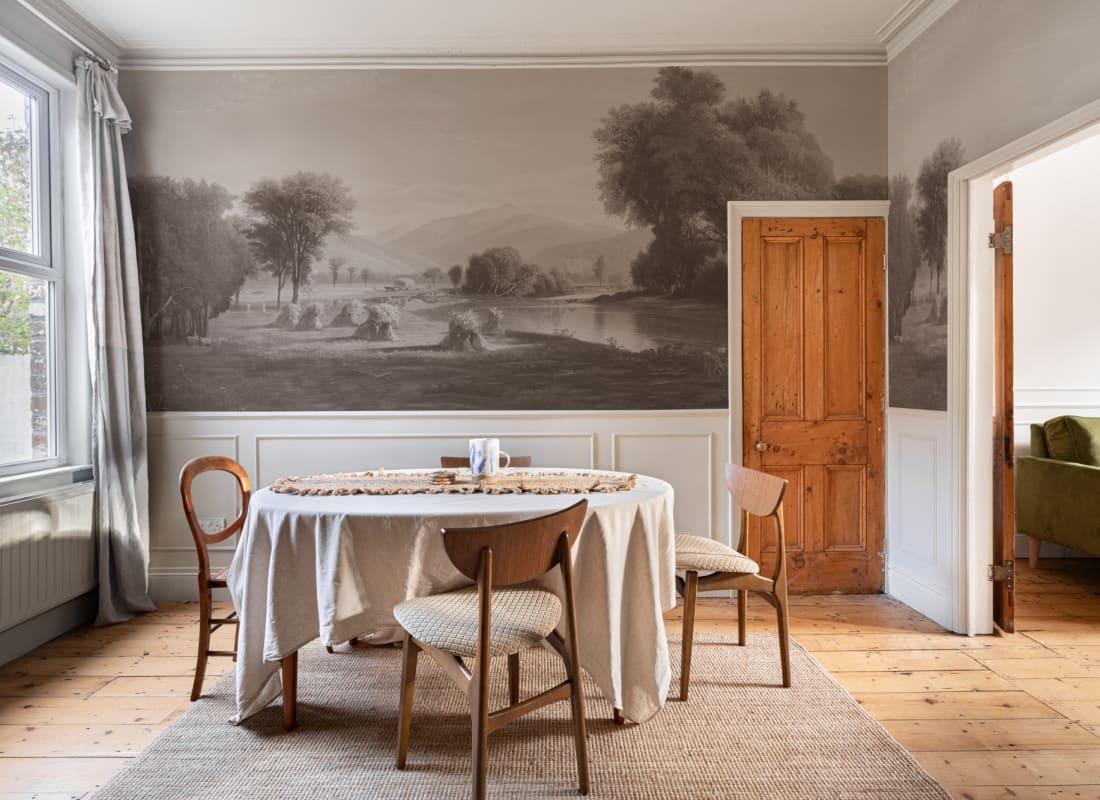 Mural Hovia Hayfield Grey LA0384GE03W przedstawia nastrojowy krajobraz utrzymany w szlachetnej palecie chłodnych szarości. Kompozycja inspirowana klasycznym malarstwem amerykańskim przyciąga spokojem form i miękkim światłem, które modeluje sylwetki drzew, linii brzegowej i górskich masywów w tle. Delikatne przejścia tonalne i tekstura przypominająca powierzchnię płótna podkreślają malarski rodowód dekoracji, nadając jej autentycznego charakteru. Model Hovia LA0384GE03W Hayfield Grey idealnie harmonizuje z wnętrzami w stylu vintage, cottage oraz modern farmhouse, w których dominują naturalne materiały i stonowane kolory. Do każdego pomieszczenia wprowadzi atmosferę klasycznej elegancji – sprawdzi się m.in. w jadalni, salonie czy gabinecie. Ten mural nie konkuruje z wyposażeniem – działa jak rama dla całego wnętrza, budując wrażenie spokoju, przestrzeni i subtelnego wyrafinowania.