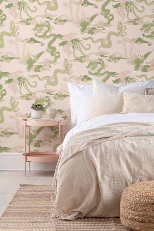 Tapeta Hovia Imperial Green MX5574PA06R przedstawia dekoracyjny układ smoków i feniksów inspirowanych estetyką chińskiego folkloru. Kompozycja opiera się na ręcznie rysowanych sylwetkach wijących się stworzeń, które płynnie przechodzą przez miękkie obłoki i stylizowaną roślinność. Jasnozielone kontury, połączone z delikatnym, różowobeżowym tłem, wprowadzają do wnętrza wrażenie świeżości, a jednocześnie zachowują bogaty, klasyczny charakter. Subtelny kontrast pozwala zachować wizualną lekkość, dzięki czemu tapeta sprawdza się zarówno na dużych powierzchniach, jak i jako akcent na jednej ścianie. Wzór ten współgra z naturalnymi tekstyliami, drewnem i pastelowymi dodatkami, podkreślając harmonię aranżacji. Dekoracja Hovia MX5574PA06R Imperial Green równoważy orientalną symbolikę z nowoczesnym minimalizmem, dodając przestrzeni elegancji i kreatywnej energii.