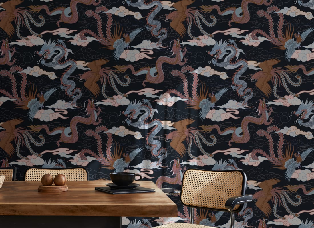 Tapeta Hovia Imperial Dark MX5577DA06R emanuje głębią i tajemniczością, reinterpretując klasyczny chiński motyw z nowoczesnym rozmachem. Kontrast między grafitową bazą a ciepłymi tonami rudości, kremu i szarości podkreśla złożoność detali – smoki i feniksy zdają się poruszać na gęstym, nocnym niebie. Wyrazista kreska, inspirowana tradycyjnym malarstwem tuszem, nadaje kompozycji lekkości mimo wizualnej intensywności. Tapeta tworzy silny punkt centralny, idealny do jadalni lub gabinetu, gdzie przestrzeń zyskuje teatralną atmosferę i wyrafinowany charakter. Dekoracja Hovia MX5577DA06R Imperial Dark podkreśla odwagę w doborze wzorów i kolorów, wprowadzając mistyczny rytm oraz bogactwo kulturowych odniesień. W zestawieniu z naturalnym drewnem, ciemnymi tkaninami i akcentami z metalu stworzy wyrafinowane, pełne szyku wnętrze.
