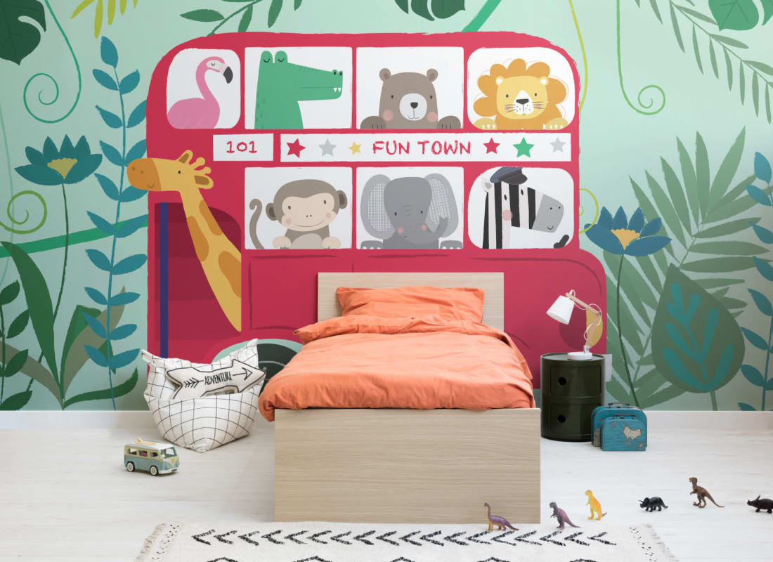 Mural Hovia Ark NS0015MU02W przedstawia radosną scenę, w której egzotyczne zwierzęta podróżują stylizowanym autobusem typu londyński routemaster. Kompozycja łączy motyw klasycznego środka transportu z dziecięcą estetyką, tworząc pogodny, przyjazny świat, pełen ruchu i koloru. Wzór zbudowany na kontrastowym tle wykorzystuje intensywne, ale zbalansowane barwy – ciepłe czerwienie autobusu, miękkie beże oraz pastelowe akcenty harmonijnie współgrają z detalami postaci zwierząt. Mural Hovia NS0015MU02W Ark idealnie wpisuje się w stylistykę pokojów dziecięcych, oferując estetykę zrozumiałą dla najmłodszych, a jednocześnie atrakcyjną wizualnie dla dorosłych. Dzięki dużym, czytelnie zdefiniowanym formom, wzór sprzyja budowaniu narracji i pobudza wyobraźnię. Mural doskonale prezentuje się w połączeniu z jasnymi meblami i dodatkami w stylu skandynawskim, podkreślając nowoczesny, rodzinny charakter wnętrza.