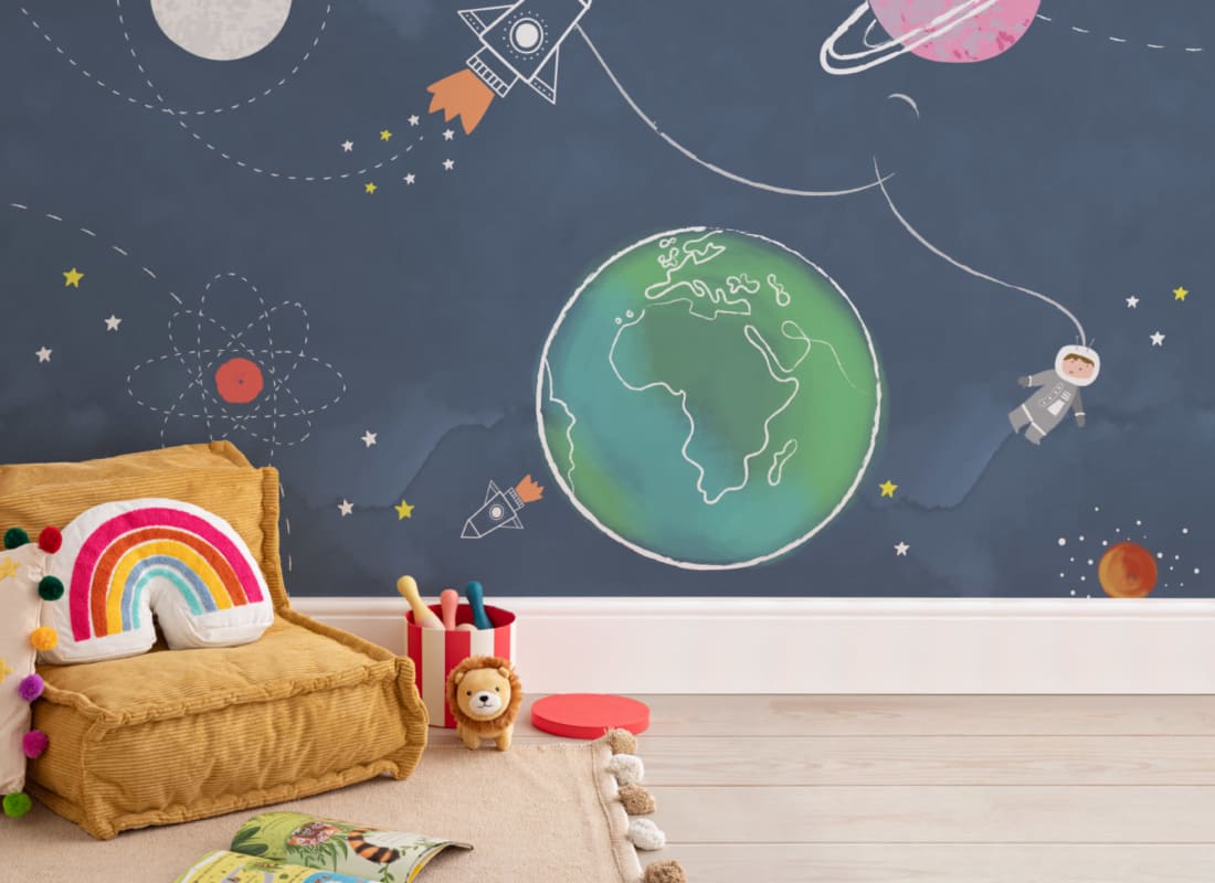Mural Hovia Gravity NS0032BU02W przedstawia kosmiczną scenę w formie rysunkowej, idealnie dopasowaną do wnętrz dziecięcych. Projekt ukazuje dynamiczne kompozycje planet, rakiet, astronauty i orbitujących ciał niebieskich na tle głębokiego granatu, co nadaje przestrzeni wrażenia głębi i spokoju. Ilustracje są miękkie w formie i utrzymane w pastelowych, łagodnych barwach – zrównoważonych akcentami różu, pomarańczu i bieli. Mural Hovia NS0032BU02W Gravity wspiera rozwój poznawczy, inspirując do eksploracji tematów naukowych i wzbudzając zainteresowanie światem. Dobrze komponuje się z nowoczesnymi, skandynawskimi meblami i tekstyliami w neutralnych tonacjach. To wzór, który łączy funkcję edukacyjną z dekoracyjną, nadając przestrzeni charakteru.