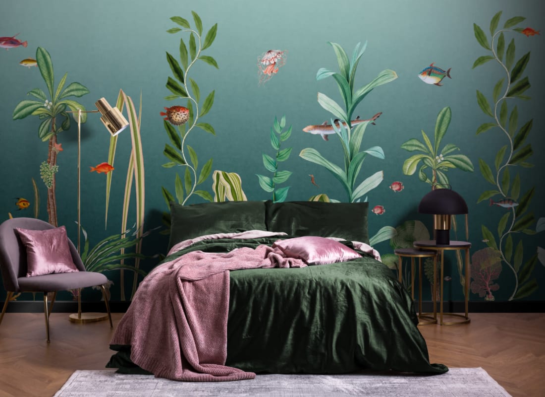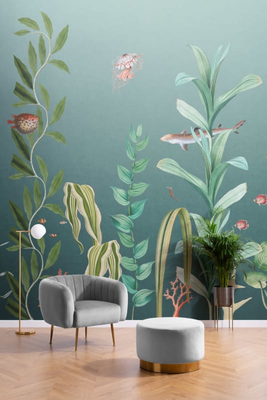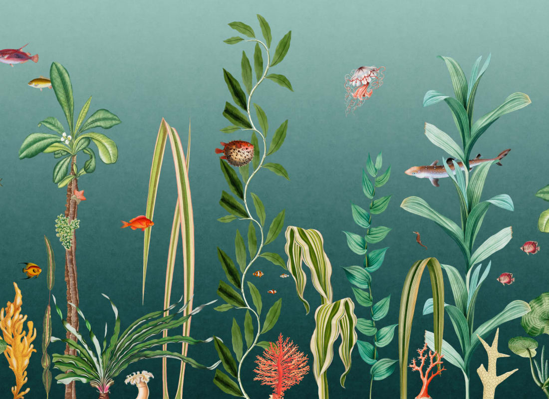Mural Hovia Under The Sea Teal OC0036GR03W przedstawia bujną, podwodną scenerię, w której rośliny morskie, egzotyczne ryby i koralowce tworzą harmonijną, dynamiczną kompozycję. Tło w odcieniu głębokiego turkusu, przechodzące w gradientowe cieniowanie, wzmacnia wrażenie przestrzeni i nadaje aranżacji subtelnej głębi. Nasycona paleta barw – od żywej czerwieni, po jasne pomarańcze – kontrastuje z chłodną bazą i wprowadza element dekoracyjnej ekspresji. Wzór przyciąga wzrok i doskonale sprawdza się jako centralny punkt w sypialni, jadalni lub strefie relaksu. Ozdobne detale roślin i morskich stworzeń zostały precyzyjnie zilustrowane, co podnosi walory estetyczne modelu. Dekoracja Hovia OC0036GR03W Under The Sea Teal równoważy naturalną inspirację z graficzną precyzją, nadając przestrzeni świeżości i indywidualnego charakteru.