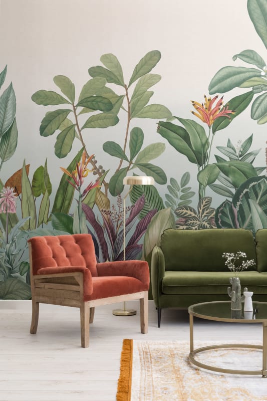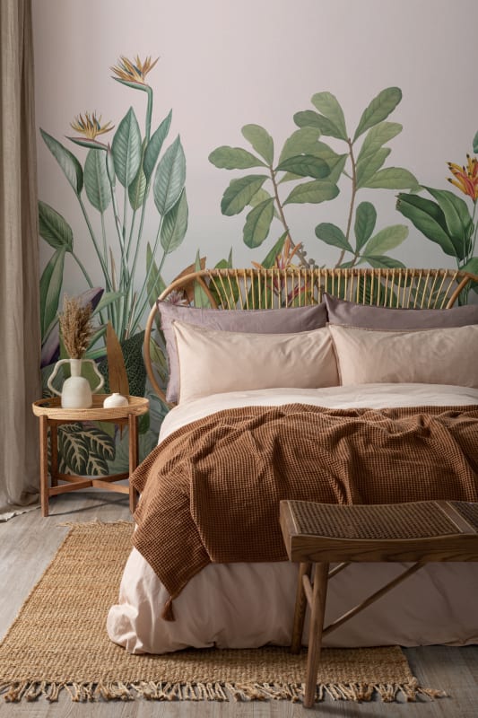 Mural Hovia Oasis Green TR0048GR03W prezentuje gęstą roślinność w intensywnie zielonej palecie. Kompozycja zawiera realistycznie zilustrowane liście figowców, strelicji oraz wielu gatunków tropikalnych, które układają się w spójną, warstwową strukturę. Rysunkowy styl wzoru równoważy bujność form, przez co mural nie dominuje nad wnętrzem, lecz harmonijnie współgra z drewnianymi meblami, naturalnymi tkaninami i stonowanymi barwami. Delikatne przejścia tonalne w tle nadają głębi, a botanika w dużej skali wzbogaca przestrzeń optycznie i tematycznie. Mural Hovia TR0048GR03W Oasis Green doskonale odnajduje się zarówno w sypialniach, jak i pokojach dziennych, wprowadzając relaksującą atmosferę. Dzięki swojej uniwersalności model ten z powodzeniem wpisuje się zarówno w aranżacje nowoczesne, jak i te inspirowane stylem eklektycznym czy urban jungle.