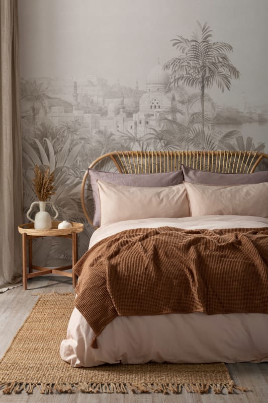 Mural Hovia Valley of Palms Greige TR0073NE04W przedstawia ręcznie malowaną panoramę inspirowaną orientalistycznymi grafikami XIX wieku. Kompozycja bazuje na połączeniu detali świątyń i architektury Bliskiego Wschodu z bujną roślinnością tropikalną. Ilustracja autorstwa Davida Robertsa i Oswalda de Kerchove de Denterghema zyskuje nowy wymiar dzięki neutralnej, monochromatycznej kolorystyce. Produkt Hovia TR0073NE04W Valley of Palms Greige stawia na subtelność – jasna paleta optycznie rozświetli przestrzeń i pozwala na swobodne łączenie z różnymi materiałami, takimi jak drewno, rattan, len czy ceramika. Dekoracja doskonale sprawdzi się w pokojach dziennych, sypialniach i przestrzeniach wypoczynkowych. Mural wprowadzi wizualną lekkość i delikatną egzotykę, zachowując przy tym elegancki, wyważony charakter, idealny do aranżacji w duchu organic modern lub klasycznego eklektyzmu.