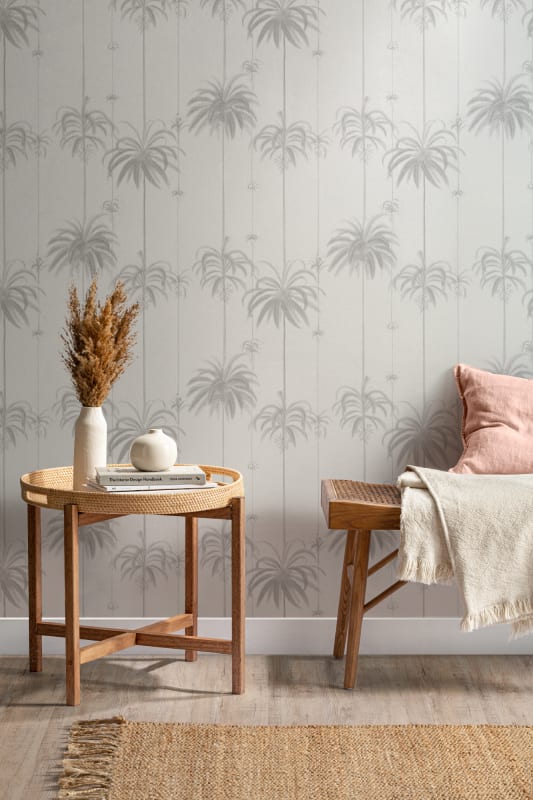 Tapeta Hovia Queen Palm Greige TR5616NE04R przedstawia graficzne sylwetki tropikalnych palm rozmieszczone równomiernie na neutralnym, kremowoszarym tle. Motyw tworzy pionową strukturę wizualną, która subtelnie podkreśla wysokość pomieszczenia i optycznie porządkuje przestrzeń. Wzór bazuje na klasycznych, uproszczonych ilustracjach, które nawiązują do estetyki vintage, ale w nowoczesnym, minimalistycznym ujęciu. Dekoracja Hovia TR5616NE04R Queen Palm Greige stanowi idealne rozwiązanie dla wnętrz, w których liczy się wizualna lekkość i spokojna elegancja. Stonowana kolorystyka zapewnia wszechstronność kompozycyjną – pięknie współgra z naturalnym drewnem, jasną tapicerką i dekoracjami w stylu organicznym. Tapeta sprawdza się w sypialniach, salonach oraz jadalniach, gdzie zbuduje atmosferę wyciszenia i klasy. Delikatna, nieprzytłaczająca grafika pozwala na wprowadzenie tropikalnego akcentu w sposób wyważony i estetycznie dopracowany.