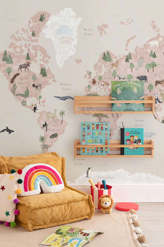 Mural Hovia Explore Neutral WM0045PI04W przedstawia subtelną mapę świata, w której każdy kontynent zyskuje stonowaną, pudrową kolorystykę – od przygaszonego różu, po naturalne beże. Neutralna paleta barw pozwala na płynne dopasowanie do aranżacji utrzymanych w stylach scandi-boho lub nowoczesnym. Ilustracje wykonane ręcznie akwarelą ukazują zróżnicowaną faunę globalną, wspierając rozwój wiedzy geograficznej w estetyczny sposób. Mural Hovia WM0045PI04W Explore Neutral tworzy przemyślaną kompozycję idealną na ściany o większej powierzchni, gdzie może zaistnieć jako dekoracyjny punkt centralny. Dzięki edukacyjnemu charakterowi i łagodnej estetyce znakomicie sprawdza się w pokoju dziecięcym lub kąciku do nauki, wzmacniając jednocześnie atmosferę spokoju i ciekawości świata.