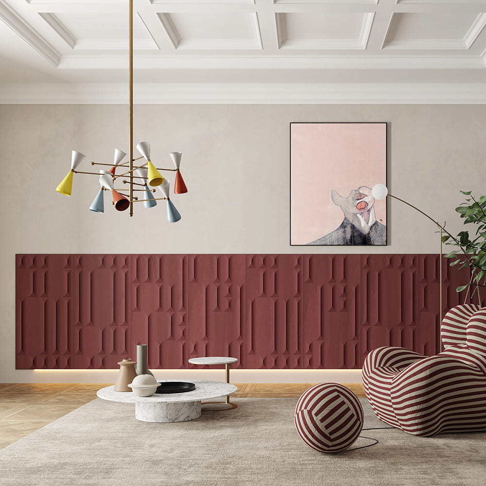 Kolekcja murali Inkiostro Bianco Lineadeko 2022 Groove łączy języki sztuki i architektury w serii dekoracji interpretowanych przez Inkiostro Bianco i Studio Lucchesedesign. Nowe pomysły przynoszą trójwymiarowy efekt wizualny, przerywany ciągiem znaków i harmonii. Projekty wzbudzają w każdym, kto zatrzyma się na ich obserwowanie, uczucie wyciszenia i odprężenia duszy. System okładzin na panelach stosowany jako okładzina boazeryjna lub całkowita, który pozwala różnym elementom architektonicznym komunikować się w domu, projektując geometrie i dekoracje, które definiują zrównoważony i harmonijny styl. Wszystkie projekty zrobione są z niezwykle wytrzymałej sklejki brzozowej. Wszystkie projekty zrobione są z niezwykle wytrzymałej sklejki brzozowej.