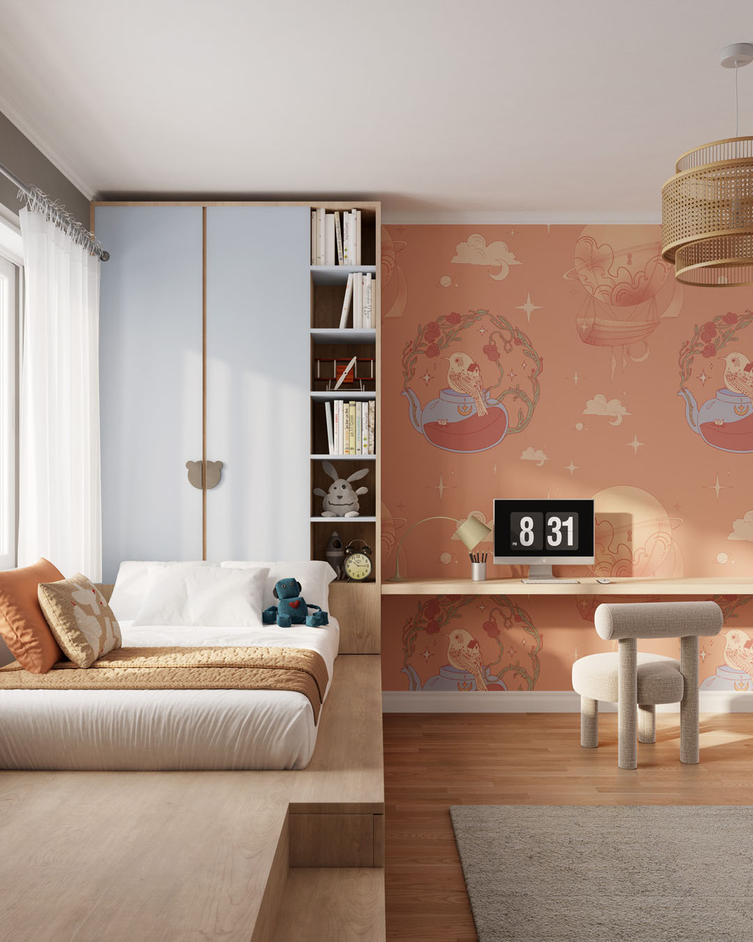 Mural Inkiostro Bianco INKHPEE2501 InKids The Potion to wyjątkowa dekoracja ścienna do pokoju dziecięcego, która łączy baśniową symbolikę z fantazyjnym klimatem, tworząc przestrzeń pełną marzeń i wyobraźni. Wzór baśniowy emanuje delikatnością i subtelną elegancją, nawiązując do świata magicznych opowieści. Główne motywy to ptaki siedzące na stylizowanych dzbankach w stylu vintage, otoczone wijącymi się gałązkami pełnymi jagód, co wprowadza naturalny akcent i harmonię. W przestrzeni unoszą się balony w kształcie planet i księżyców, przywodzące na myśl latające maszyny z dawnych opowieści. Na tle rozpościera się nocne niebo z gwiazdami, obłokami i księżycami, budując atmosferę spokojnej, marzycielskiej podróży. Mural Inkiostro Bianco InKids The Potion INKHPEE2501 urzeka zrównoważonym połączeniem natury i kosmicznych elementów, które wspólnie tworzą narrację pełną tajemnic i nostalgii. Precyzyjnie dobrana kolorystyka oraz staranne detale podkreślają poetyckość wzoru, nadając wnętrzu dziecięcemu unikalny, magiczny charakter.