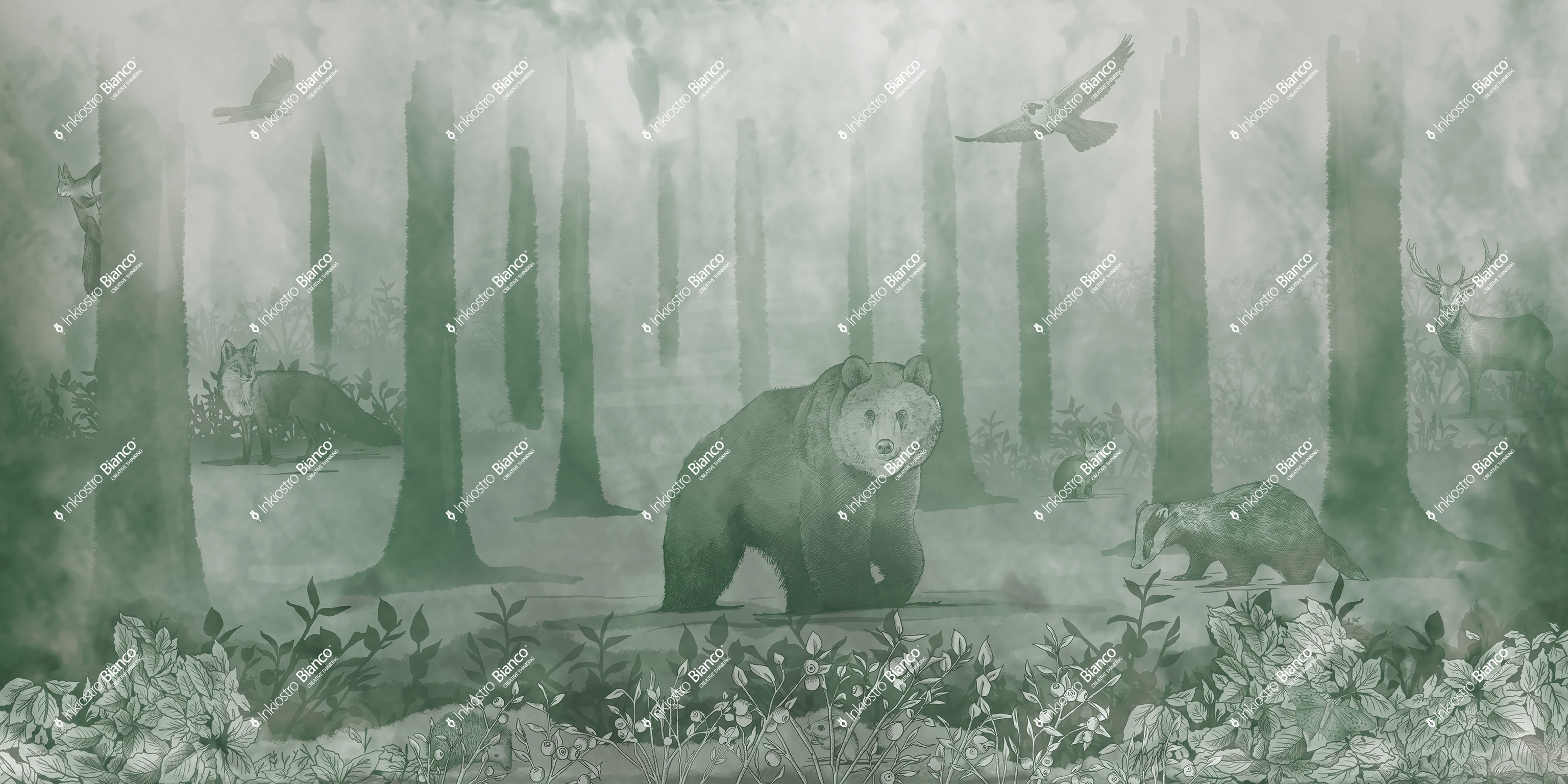Mural Inkiostro Bianco INKISRG2501 InKids Shivelight to dekoracja pełna leśnego uroku i naturalnej harmonii. Centralnym motywem jest majestatyczny niedźwiedź przemierzający spokojnie ścieżkę w otoczeniu wysokich, smukłych drzew otulonych mglistym woalem. Subtelne promienie słońca przeciskają się przez korony, rozpraszając poranną mgłę i nadając scenerii poetycki charakter. W tle widać inne leśne zwierzęta: jelenie i lisy czujnie obserwujące otoczenie oraz ptaki w locie, unoszące się ponad polaną. Delikatnie zarysowane sylwetki zwierząt i ptaków dodają wzorowi autentyczności, wprowadzając wrażenie ruchu i życia w głębinach lasu. Mural Inkiostro Bianco InKids Shivelight INKISRG2501 wyróżnia się realistycznym podejściem do natury, podkreślając piękno dzikiej przyrody w jej pierwotnym wydaniu. Kompozycja wprowadza do pokoju dziecięcego atmosferę wyciszenia, sprzyjając relaksowi i rozwojowi wyobraźni.