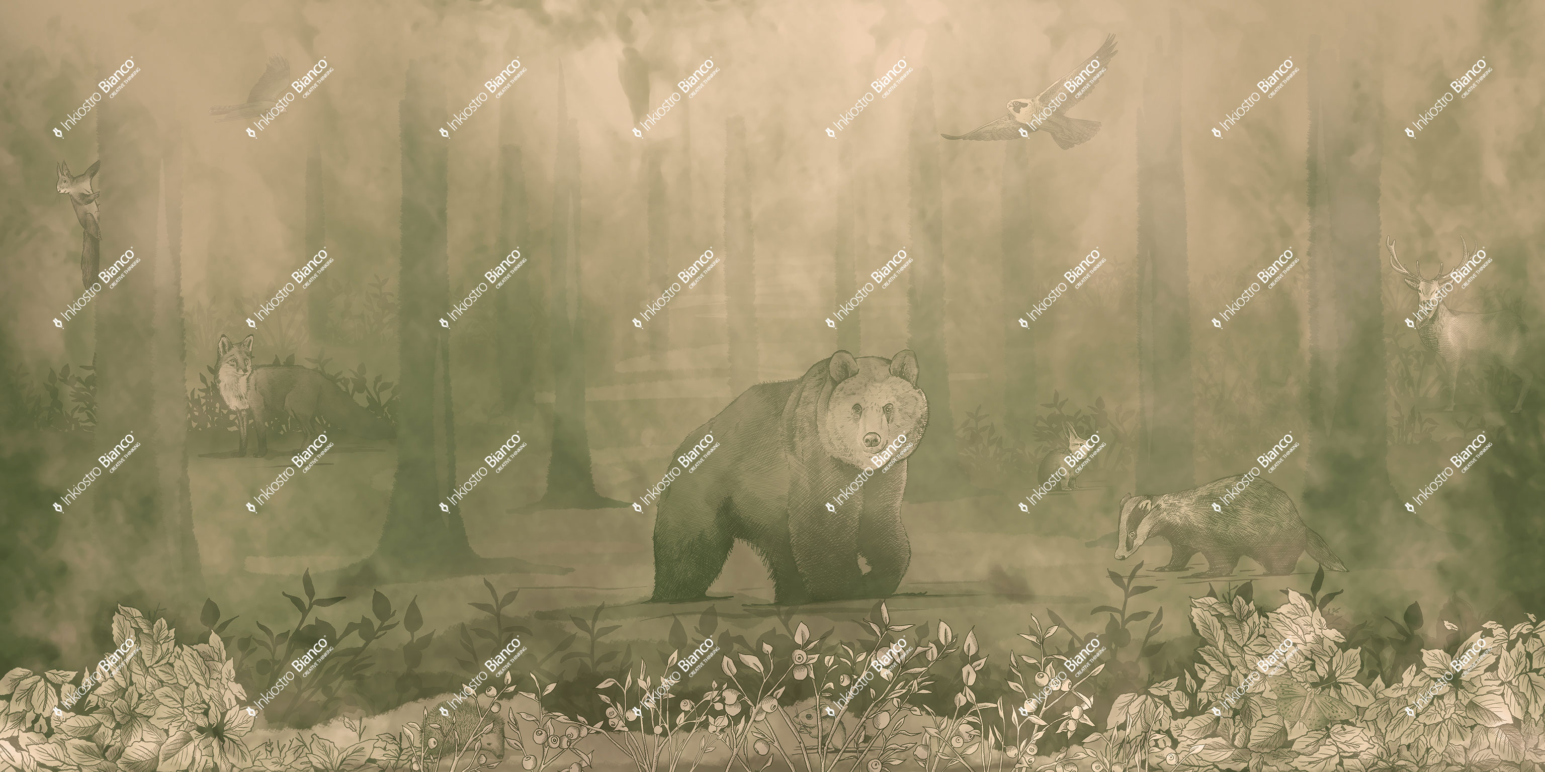 Mural Inkiostro Bianco INKISRG2503 InKids Shivelight to wyjątkowa dekoracja wprowadzająca do dziecięcego pokoju aurę tajemniczego lasu pełnego życia i harmonii. Wzór leśny ze zwierzętami przedstawia malowniczy krajobraz, w którym dominują smukłe, wysokie drzewa otulone delikatną mgłą. Pnie drzew wznoszą się pionowo, tworząc efekt przestronności i głębi, nadając wnętrzu naturalny rytm. Na pierwszym planie widoczny jest niedźwiedź spokojnie przemierzający leśną ścieżkę. Scena pełna subtelnych detali oddaje klimat poranka w lesie, gdy natura powoli budzi się do życia. W tle dostrzec można inne leśne zwierzęta – jelenie i lisy wpatrzone w głąb lasu oraz ptaki szybujące w powietrzu, unoszące się nad polaną, podkreślając delikatność i lekkość kompozycji. Przez korony drzew przebijają się promienie słońca, rozświetlając krajobraz i podkreślając mglisty, eteryczny charakter wzoru. Mural Inkiostro Bianco InKids Shivelight INKISRG2503 oddaje naturalne piękno i ciszę dzikiego lasu, tworząc atmosferę relaksu i wyciszenia. Ta dekoracja idealnie komponuje się z aranżacjami inspirowanymi przyrodą, wprowadzając do pokoju dziecięcego przyjazny i spokojny klimat.