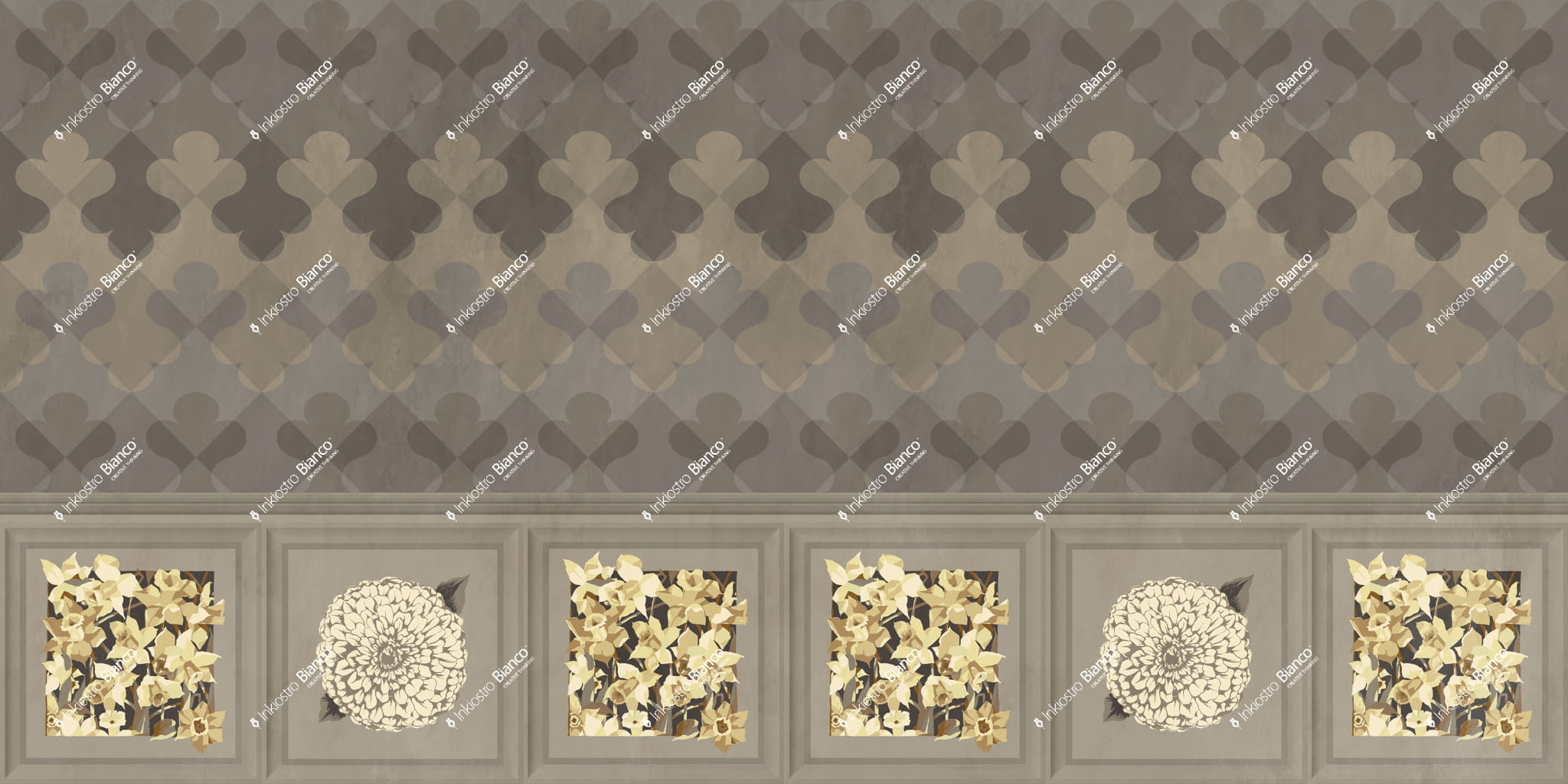 Mural Inkiostro Bianco Ken Scott Unconventional INKMMMA2401 Vanita Bloom Zigano to połączenie klasycznej elegancji i nowoczesnej geometrii, które tworzy wyrafinowaną kompozycję na ścianie. Górna część wzoru to geometryczny motyw rombów i szachownic, który wprowadza rytmiczną strukturę i subtelny, dekoracyjny charakter. Dolna część z kolei imituje boazerię, w której ramy sztukaterii wypełnione są delikatnymi roślinnymi wzorami – jeden z nich przedstawia pełen wdzięku kwiat, drugi zaś dynamiczny, bardziej abstrakcyjny motyw botaniczny. Całość łączy w sobie bogactwo detali z harmonią kompozycji, tworząc mural, który nie tylko zdobi, ale także podkreśla charakter przestrzeni. Inkiostro Bianco INKMMMA2401 Ken Scott Unconventional Vanita Bloom Zigano to propozycja dla wnętrz, które pragną balansować pomiędzy tradycją a nowoczesnością, oferując elegancki, a zarazem wyrazisty efekt wizualny.