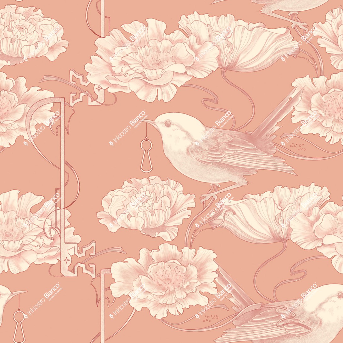 Mural Inkiostro Bianco INKNITO2502 InKids The Magic Look to dekoracyjna kompozycja o romantycznym charakterze, która nadaje wnętrzu dziecięcemu subtelny, baśniowy klimat. Wzór w kwiaty i ptaki, inspirowany światem natury i symboliką tajemnic, wyróżnia się wyrafinowaną estetyką. Na pierwszym planie widoczne są ptaki siedzące pośród bujnych, rozkwitających kwiatów, których płatki układają się w eleganckie, faliste formy. Ptaki trzymają w dziobach klucze, co nadaje kompozycji intrygujący, zagadkowy ton, podkreślając motyw odkrywania tajemnic. Całość wzoru układa się w symetryczne powtórzenia, tworząc harmonijną, spokojną kompozycję, która łączy naturalną lekkość z delikatnym akcentem mistycznym. Mural Inkiostro Bianco InKids The Magic Look INKNITO2502 przyciąga uwagę wysublimowaną kolorystyką oraz precyzją detali, co dodaje wnętrzu wyrafinowanego uroku.