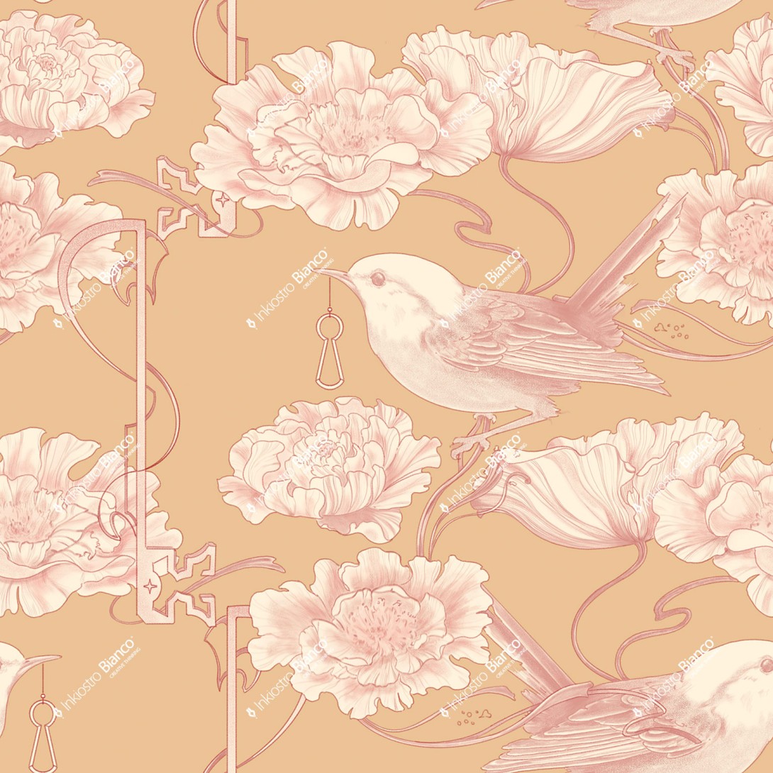 Mural Inkiostro Bianco INKNITO2503 InKids The Magic Look to wyjątkowa dekoracja ścienna do pokoju dziecięcego, emanująca romantycznym wdziękiem i subtelną tajemniczością. Wzór w kwiaty i ptaki odwołuje się do naturalnej harmonii i symboliki sekretów, tworząc nastrojową kompozycję pełną elegancji. Główne motywy to ptaki siedzące pośród bujnych, rozkwitających kwiatów o falistych płatkach, których kształty wprowadzają organiczną lekkość. Ptaki trzymają w dziobach klucze, co nadaje wzorowi intrygujący, zagadkowy charakter, nawiązując do idei odkrywania tajemnic oraz nieoczywistych znaczeń. Cała kompozycja układa się w symetryczne powtórzenia, tworząc płynny, harmonijny rytm i podkreślając spójność aranżacyjną. Mural Inkiostro Bianco InKids The Magic Look INKNITO2503 wyróżnia się wyrafinowaną kolorystyką i precyzją wykonania, która nadaje wnętrzu dziecięcemu artystyczny, marzycielski klimat.