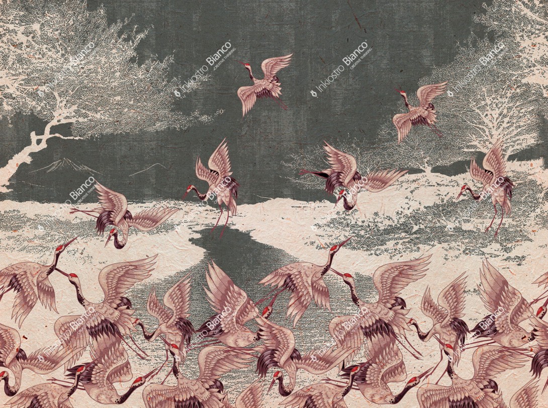 Inkiostro Bianco INKNLIA2302 Flow Begin to fly - mural z motywem żurawi nad jeziorem