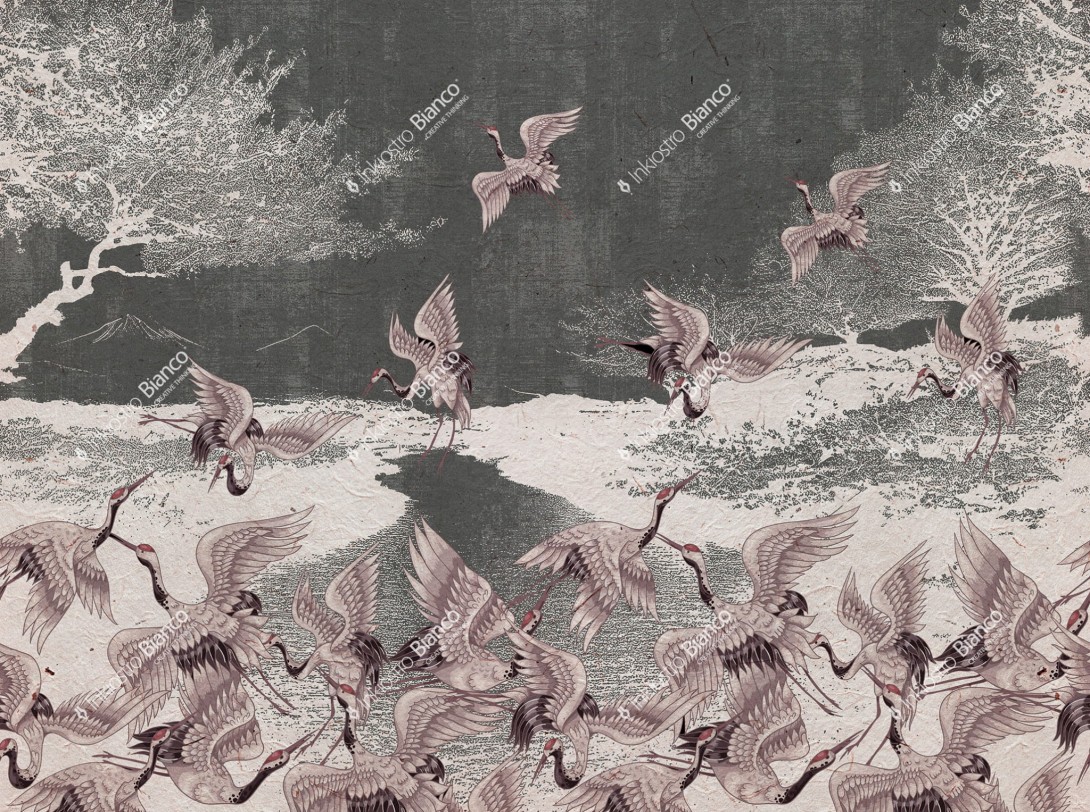 Inkiostro Bianco INKNLIA2301 Flow Begin to fly - mural z motywem żurawi nad jeziorem
