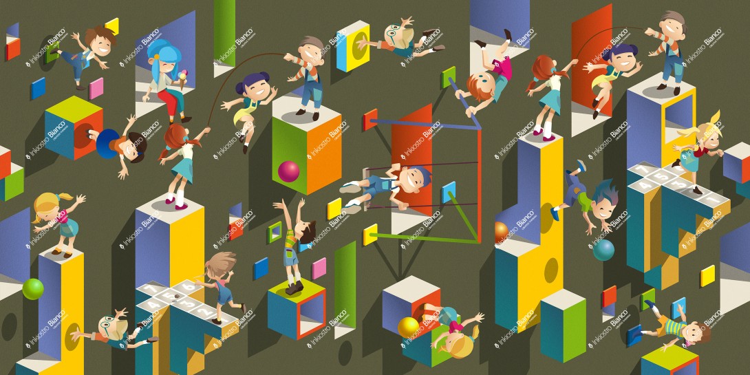 Mural Inkiostro Bianco INKPKAA2504 InKids Party wnosi do pokoju dziecięcego atmosferę pełną radości i pozytywnej energii. Scena pełna ruchu i dynamiki ukazuje grupę dzieci w wirze zabawy, otoczonych geometrycznymi bryłami o intensywnych kolorach. Konstrukcje w formie sześcianów, walców i prostopadłościanów tworzą trójwymiarową przestrzeń, w której dzieci skaczą, wspinają się i huśtają. Każda postać emanuje żywiołowością, oddając spontaniczność i beztroskę dziecięcych zabaw. Mural Inkiostro Bianco InKids Party INKPKAA2504 doskonale komponuje się zarówno z nowoczesnymi, jak i klasycznymi aranżacjami, dodając przestrzeni świeżości i młodzieńczego ducha. Ta dekoracja idealnie sprawdzi się w pokoju pełnym wyobraźni, gdzie zabawa i ruch są na porządku dziennym.