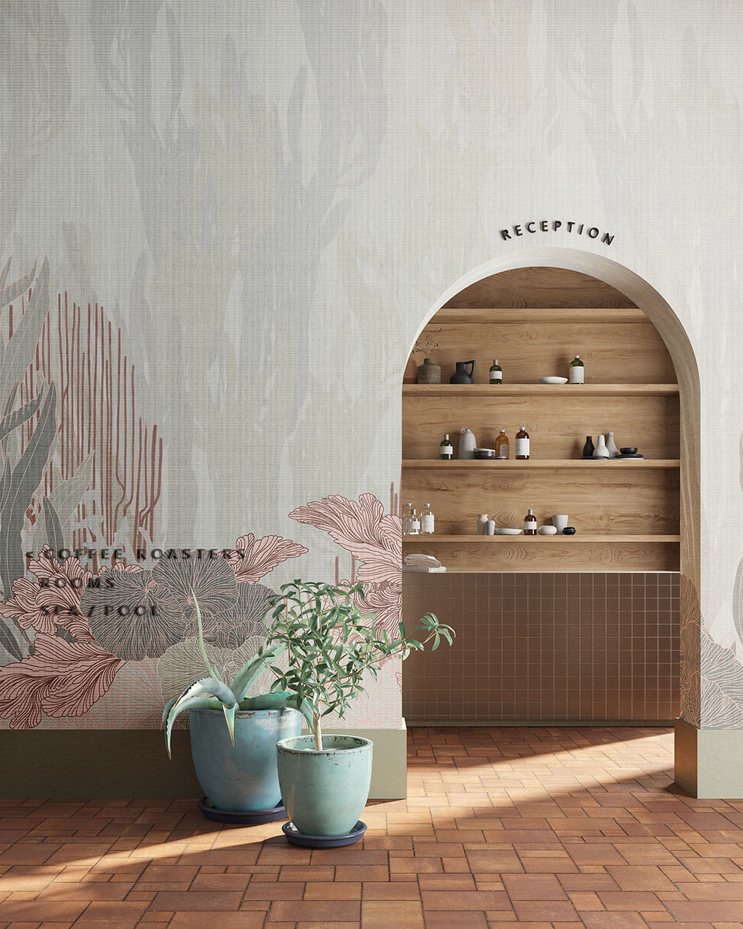 Inkiostro Bianco INKRRIA2302 Flow Marine Sound - mural z motywem liści i wodorostów na lnianym tle
