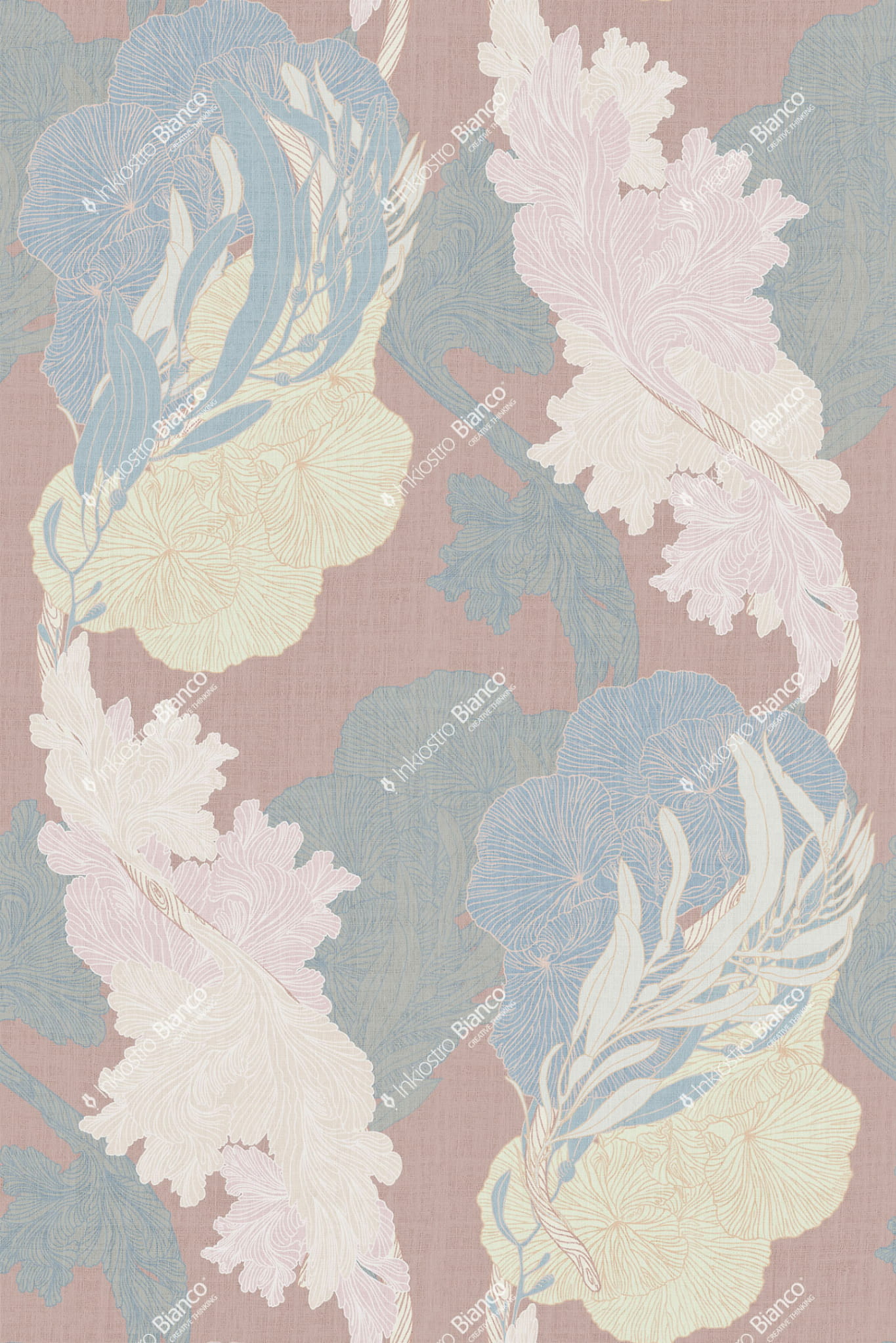 Inkiostro Bianco INKTAOH2301 Flow Ocean Symphony - mural z motywem liści na lnianym tle