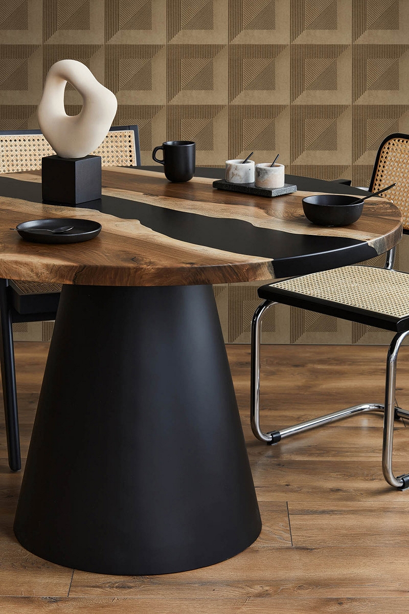 Tapeta KT Exclusive Meala ME0129 to wyjątkowe połączenie geometrycznej harmonii i luksusowej tekstury. Zaprezentowany na niej wzór doda ścianom trójwymiarowego efektu. Dekoracj ma charakter tekstylny - wykonano ją z aksamitu, dlatego jej powierzchnia doda wnętrzu głębi i elegancji. To doskonała propozycja dla przestrzeni urządzonych w stylu modern classic, art déco, glamour czy nowoczesnym, gdzie geometryczne detale grają ważną rolę. Tapeta może być efektownym akcentem na jednej ścianie lub stanowić spójne tło w całym pomieszczeniu. Wykonano ją na flizelinowym podkładzie, dlatego jest łatwa w montażu i odporna na codzienne użytkowanie. Dekoracja KT Exclusive Meala ME0129 to połączenie artystycznej geometrii z aksamitnym wykończeniem, które każdemu pomieszczeniu doda wyjątkowej głębi i ekskluzywnego wyrazu.
