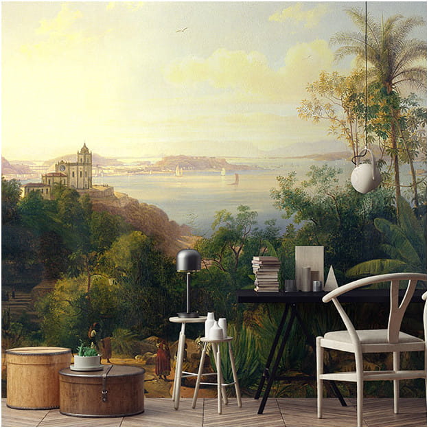 Mural Les Dominotiers Volume 2 Gloria DOM_12/7_SM zabierze Cię w podróż do Brazylii. Inspiracją do stworzenia dekoracji było dzieło austriackiego malarza Thomasa Endera. Zaprezentowany pejzaż jest zdominowany przez różnego rodzaju roślinność - głównie palmy i paprocie, które otaczają kościół Nossa Senhora da Gloria de Outeiro w Rio de Janeiro. Jasnożółte niebo stanowiące tło nadaje kompozycji ciepła. Mural Les Dominotiers DOM_12/7_SM Volume 2 Gloria doskonale komponuje się z wnętrzami inspirowanymi stylem tropikalnym lub boho, dodając im nuty egzotyki i przygody. Jednocześnie stanowi harmonijny akcent w minimalistycznych przestrzeniach, wprowadzając w nie odrobinę natury i spokoju. Dekoracja dostępna jest w wersji winylowej i flizelinowej.