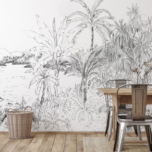 Mural Les Dominotiers Volume 7 Contrees Lointaines Hanalei Black & White DOM_502_SM przeniesie Cię na hawajską wyspę. Nazwa "Hanalei" odnosi się do wioski położonej na wyspie archipelagu hawajskiego Pacyfiku, która słynie z malowniczych zatok. Ta panoramiczna dekoracja o klasycznym i luksusowym stylu idealnie współgra z nowoczesnym wnętrzem, szczególnie w połączeniu z ciemnymi kolorami farb, takimi jak czarny, ciemnoszary, ciemnoniebieski lub ciemnozielony. Mural Les Dominotiers Enchanted DOM_502_SM Volume 7 Contrees Lointaines Hanalei Black & White dostępny jest łącznie w 2 wariantach kolorystycznych - jeden wykorzystuje patynę, a drugi technikę szkicu. Dzięki temu z łatwością dopasujesz go do własnych mebli i dodatków. Obie wersje kupisz w formie dekoracji winylowej lub flizelinowej.