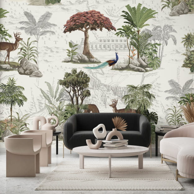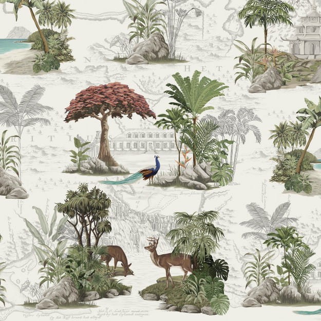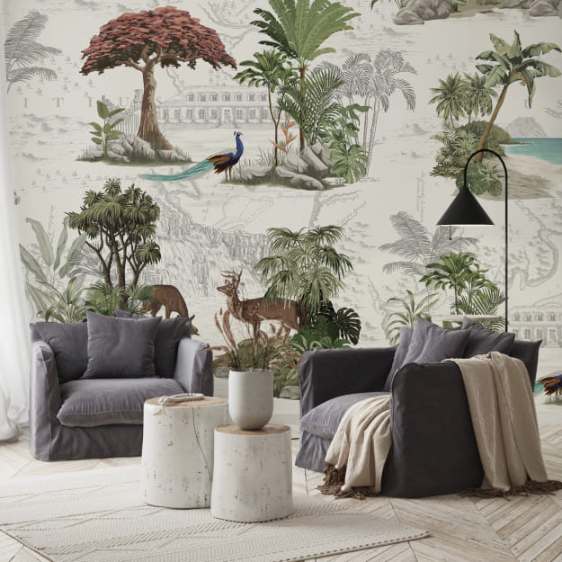 Mural Les Dominotiers Volume 8 Moris Héritage Sans DOM_603-1_SM prezentuje bogate, wielokulturowe dziedzictwo Mauritiusa poprzez uchwycenie różnych scen związanych z życiem na wyspie. Każda z nich ukazuje różnorodność kulturową i historyczną tego państwa wyspiarskiego. Na dekoracji widoczne są m.in. jelenie, które są symbolem holenderskiej przeszłości Mauritiusu, pagoda, która przywodzi na myśl różnorodność religijną i kulturową oraz kolonialne domy z ich charakterystyczną architekturą, będące świadectwem minionych epok. Dodatkowo tropikalne rośliny i laguny przypominają, dlaczego Mauritius przez dekady nazywany był rajem na ziemi. Tło muralu stanowi stara mapa wyspy, łącząca te różnorodne elementy w jedną, spójną opowieść. Dekoracja dostępna jest także w wersji z podstawą imitującą trzcinę cukrową. Mural Les Dominotiers DOM_603-1_SM Volume 8 Moris Héritage Sans Cannage doskonale odzwierciedla historyczną i kulturową mozaikę Mauritiusa, będąc zarazem eleganckim dodatkiem do każdego wnętrza. Występuje w wariancie flizelinowym i winylowym.