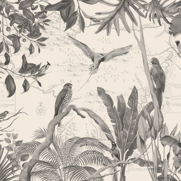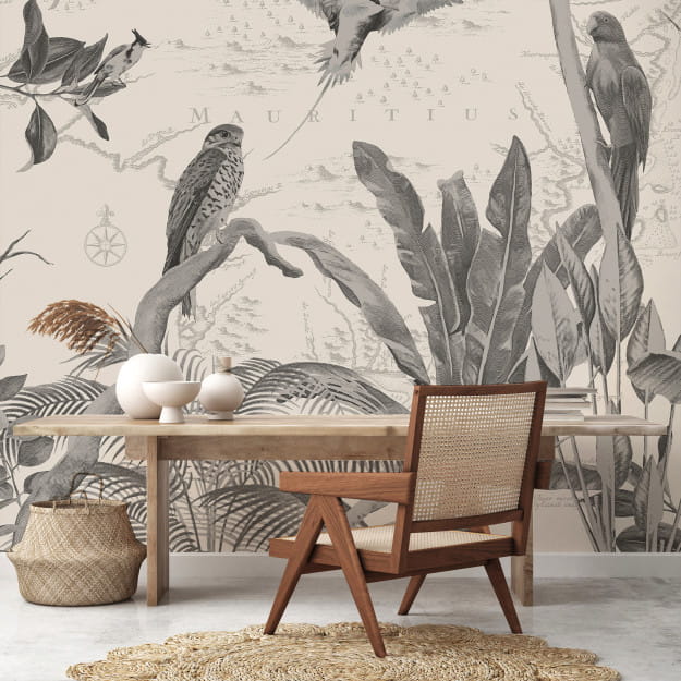 Mural Les Dominotiers Volume 8 Moris Bel Air DOM_605_SM łączy motyw roślinny z holenderską mapą z 1753 roku, która stanowi tło dekoracji. Widoczny na niej kompas oraz stare adnotacje nadają jej historycznego charakteru i autentyczność. Na pierwszym planie muralu przedstawione są ręcznie narysowane ptaki, charakterystyczne dla Mauritiusa. Całość otoczona jest tropikalną roślinnością, dodającą głębi całej kompozycji. Dzięki stonowanej palecie kolorystycznej dekoracja nie przytłoczy przestrzeni. Wniesie w nie harmonijny i przytulny klimat. Les Dominotiers DOM_605_SM Volume 8 Moris Bel Air idealnie prezentować będzie się w domowych biurach, salonach, jak i w różnego rodzaju lokalach usługowych. Dekoracja występuje w 2 wariantach - winylowym i flizelinowym.