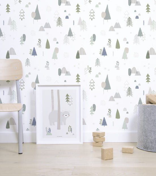 Tapeta Lilipinso H0331 In The Woods to minimalistyczna dekoracja ścienna z rysunkowymi kształtami na całej powierzchni modelu. Przywołuje ona spokojny nastrój, dzięki czemu stworzy idealne tło dla łóżeczka w pokoju dziecięcym. Tapeta prezentuje pięknie narysowane drzewa iglaste i majestatyczne niebieskie góry, które sprawiają, że maluchy mogą poczuć się, jakby podróżowały w górską krainę marzeń. Zielone drzewa kontrastują z subtelnymi, szarymi śnieżynkami, dodając głębi i magicznego uroku całej aranżacji. Tapeta Lilipinso H0331 In The Woods wprowadza spokój i harmonię, idealnie wpasowując się w senne otoczenie dziecięcego pokoju.