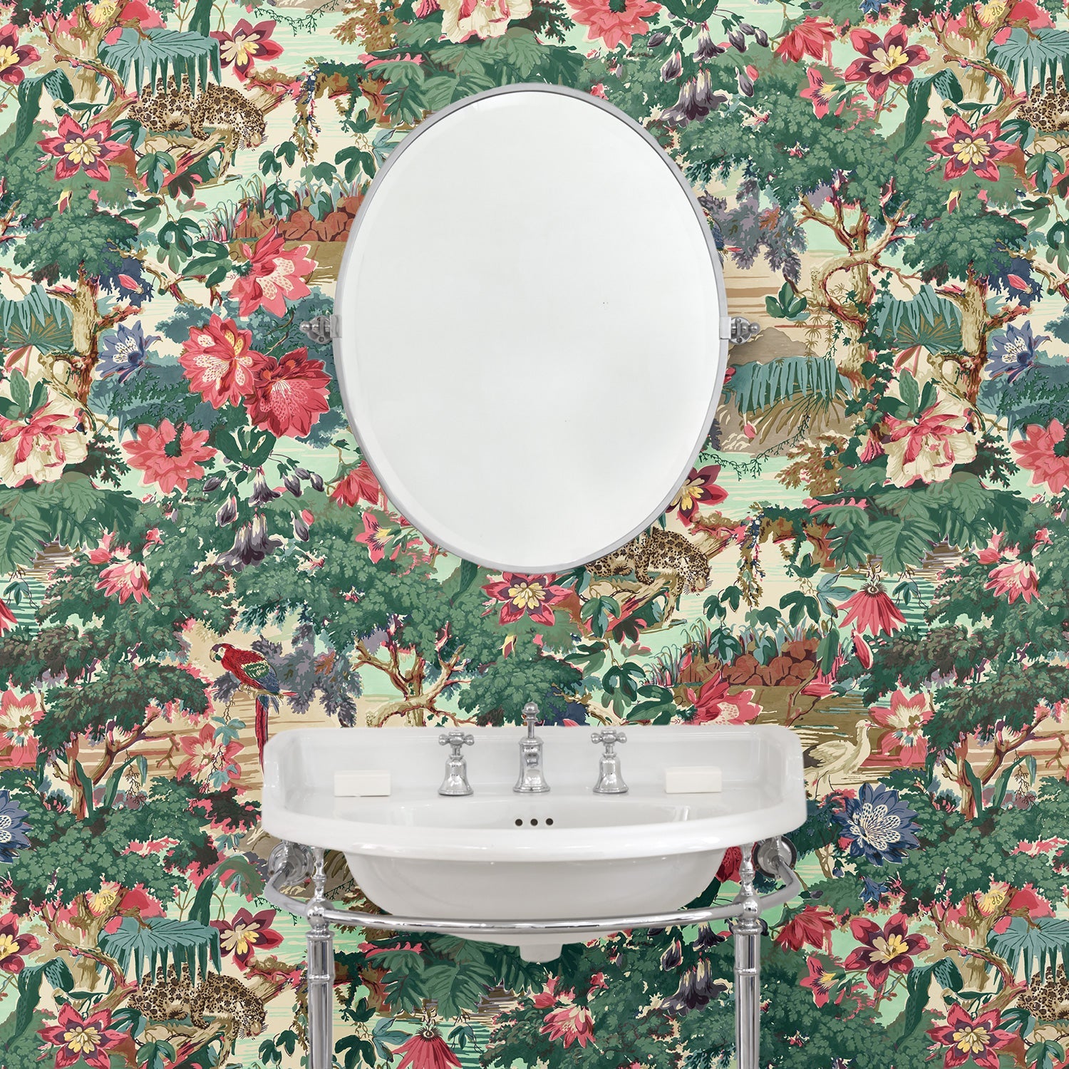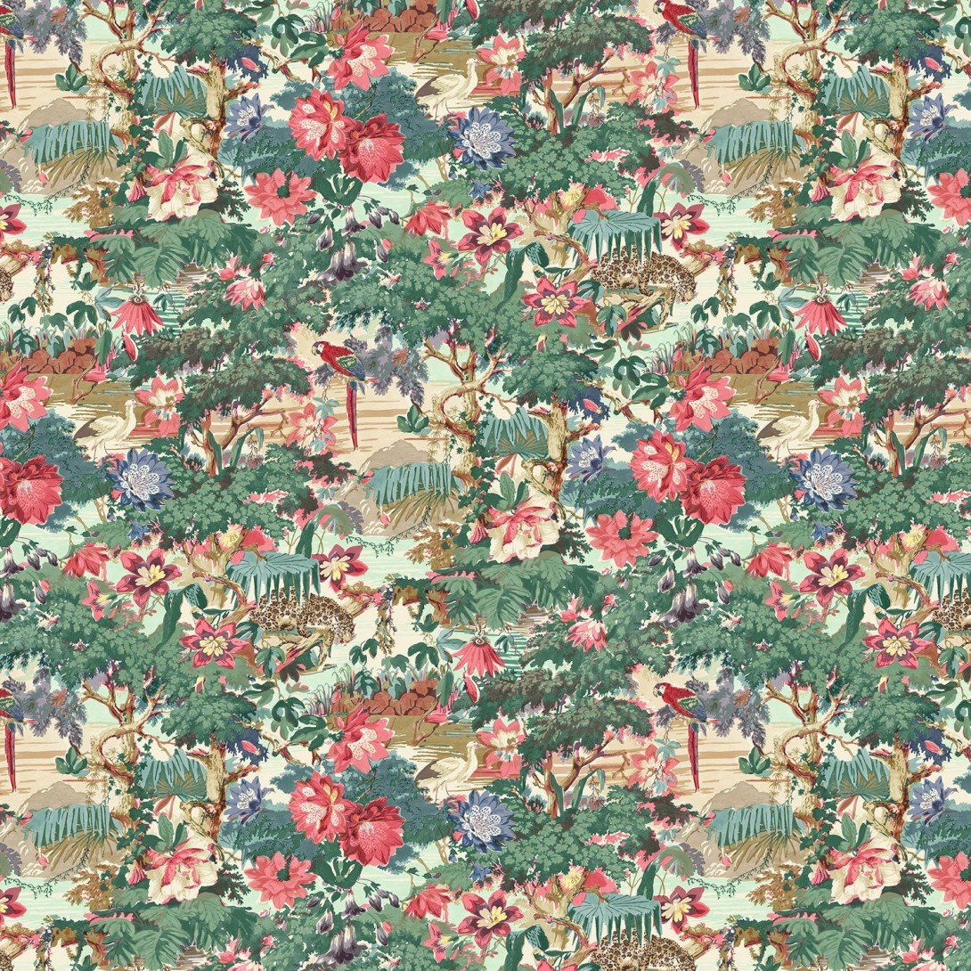 Tapeta Linwood Jungle Rumble Parrot LW076/001 prezentuje pulsujący życiem tropikalny krajobraz, w którym gęsta roślinność splata się z dziką fauną. Motyw inspirowany archiwalnym dokumentem zyskał współczesny charakter dzięki nasyconym barwom i pełnym dynamiki detalom. Na tle bujnych drzew i wodnych akcentów pojawiają się lamparty, egzotyczne ptaki i monumentalne kwiaty - każdy element został starannie opracowany, tworząc spektakularną scenę. Kolorystyka tapety Linwood Jungle Rumble Parrot LW076/001 to połączenie wyrazistych zieleni, intensywnych czerwieni, fioletów i ciepłych beżów, które wprowadzają do wnętrza energię i głębię. Wzór doskonale odnajduje się w aranżacjach odważnych, artystycznych i kolonialnych. Idealnie współgra z ciemnym drewnem, ceramiką o naturalnej fakturze i wyrazistymi tekstyliami.