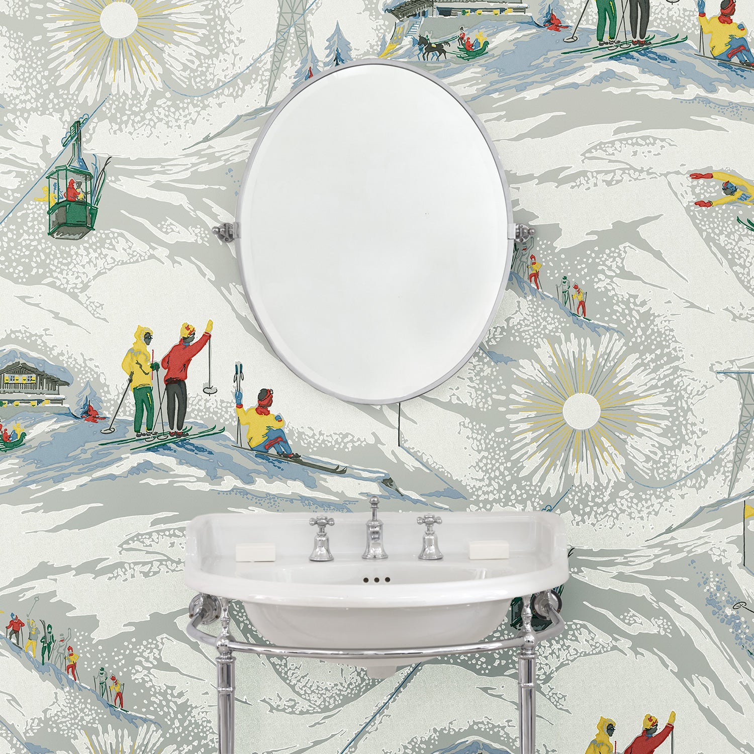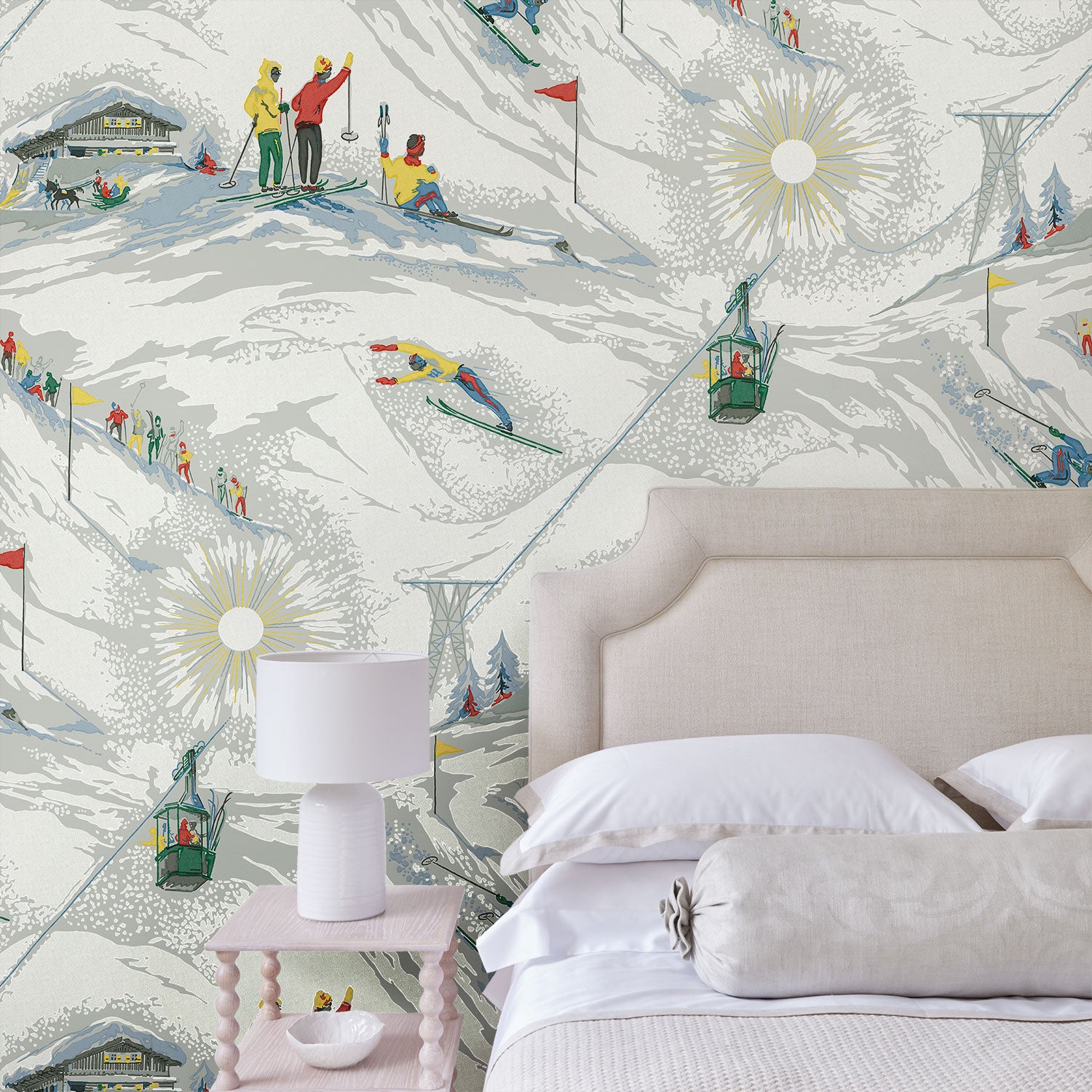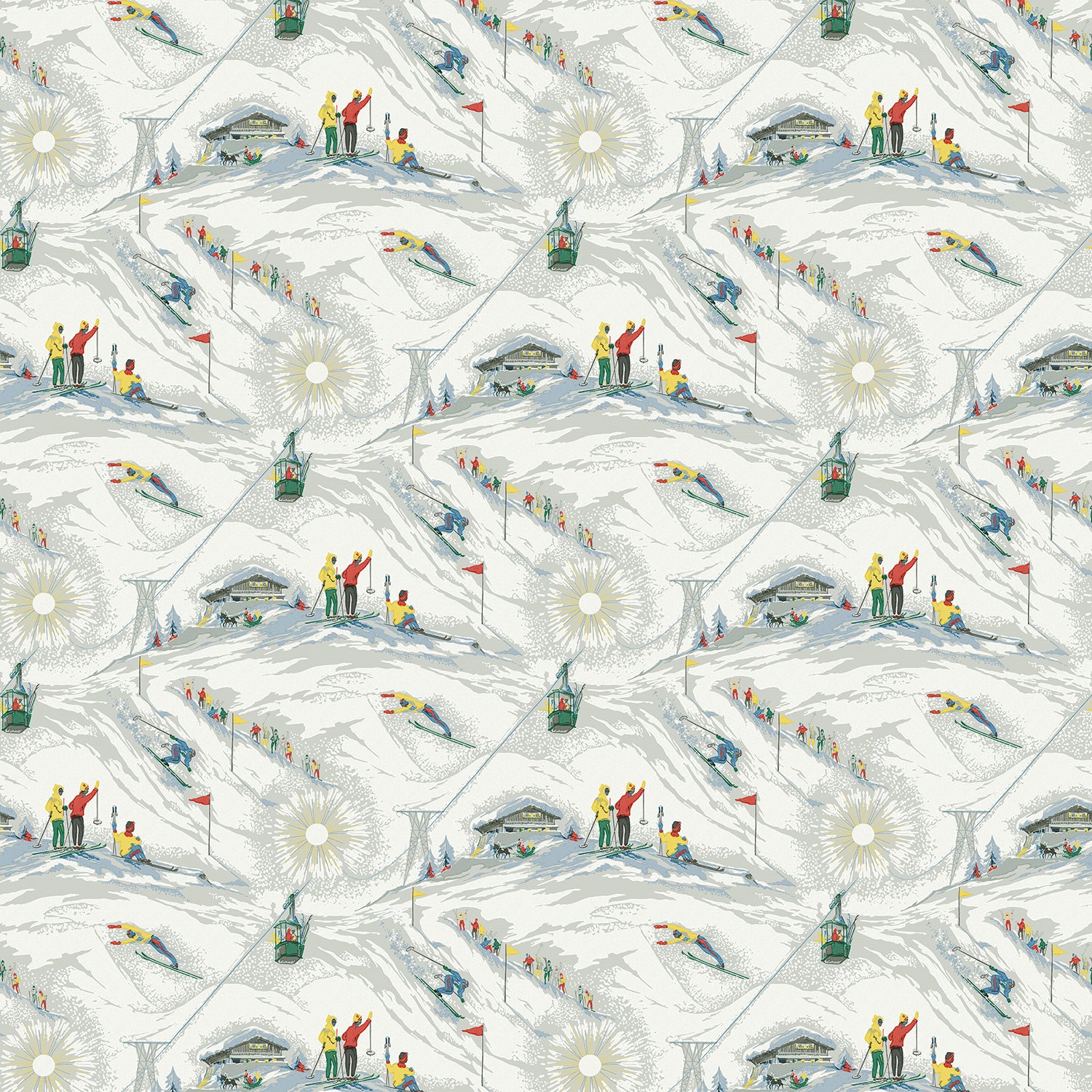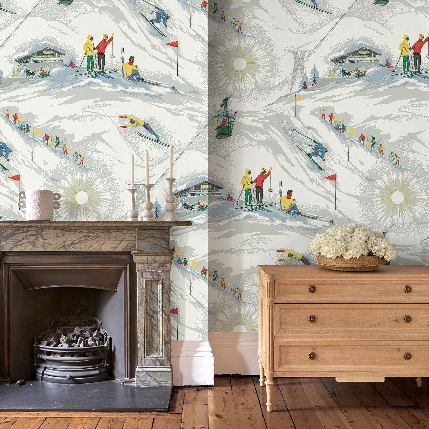 Tapeta Linwood Off Piste Alpine LW091/001 przedstawia stylizowany, górski krajobraz inspirowany archiwalnym wzorem z lat 50. Kompozycja łączy sceny z narciarskiego stoku - zjazdy, kolejki linowe, postacie w ruchu i detale architektury alpejskiej. Utrzymana w stonowanej palecie z akcentami czerwieni, żółci i zieleni. Tło w chłodnej szarości wzmacnia kontrast i czytelność rysunku. Tapeta Linwood LW091/001 Off Piste Alpine wprowadzi do wnętrza energię, ruch i retro klimat. Sprawdzi się w pokojach dziecięcych, przestrzeniach wypoczynkowych, holach i korytarzach. Dobrze wygląda na większych płaszczyznach - zbuduje rytm i strukturę. Ożywi neutralne kolory i doda charakteru jasnym wnętrzom. Jest łatwa w zestawieniu z drewnem, wełną, szkłem i naturalnymi materiałami. Wprowadzi sezonowy motyw bez nadmiernej dekoracyjności. To tapeta, która nada aranżacji świeżości i optymizmu.
