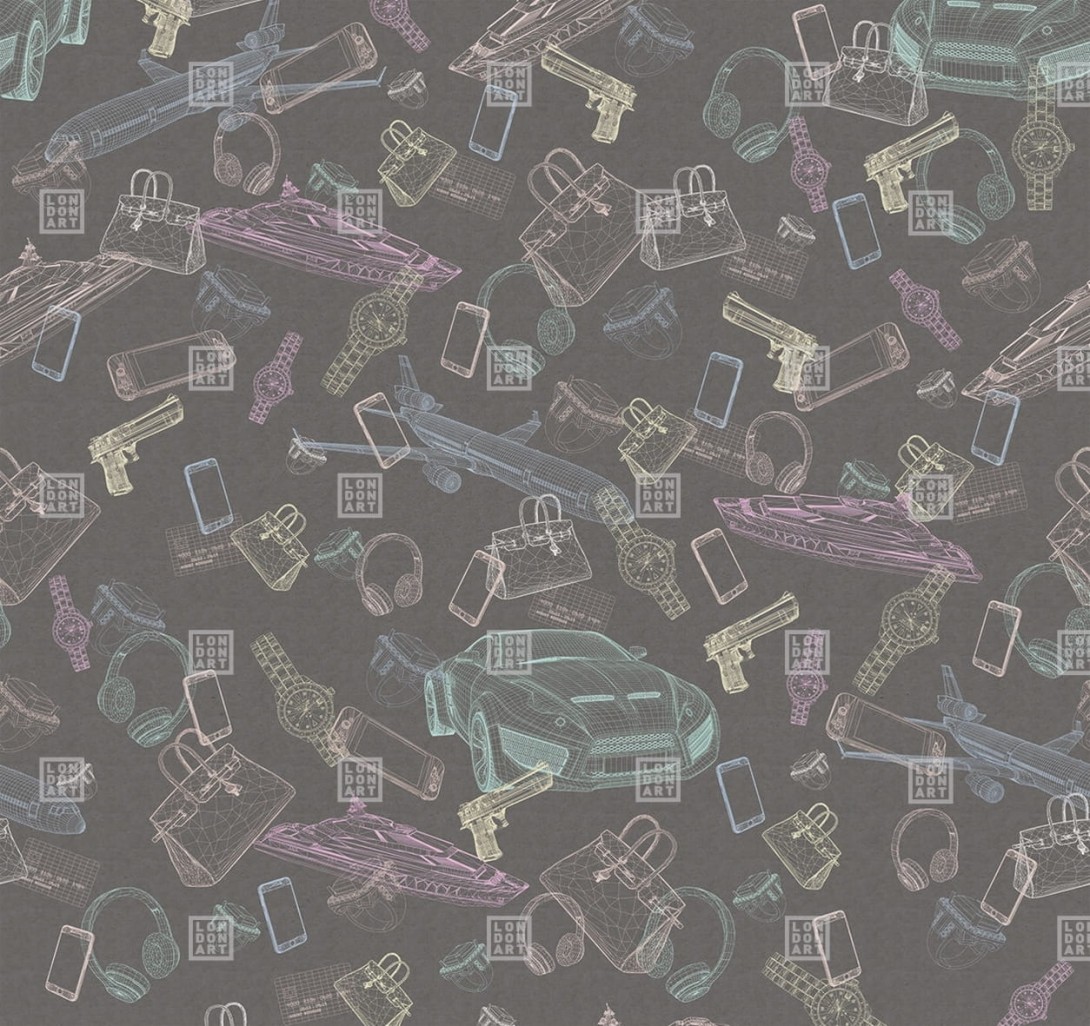 Mural London Art Exclusive 18 18003-02 Luxury Goods na ciemny tle wyeksponował neonowe wzory luksusowych dóbr, którymi mogą pochwalić się bogaci biznesmeni lub hollywoodzkie gwiazdy. Projektanci poprzez zastosowanie kolorystyczne nadali kompozycji charakter uniwersalny, umożliwiając zawieszenie dekoracji ściennej w każdym domu. Model doskonale sprawdzi się jako tło dla nowoczesnego umeblowania w salonie lub jadalni. Mural London Art Exclusive 18 18003-02 Luxury Goods dostępny jest w dwóch wariantach kolorystycznych.