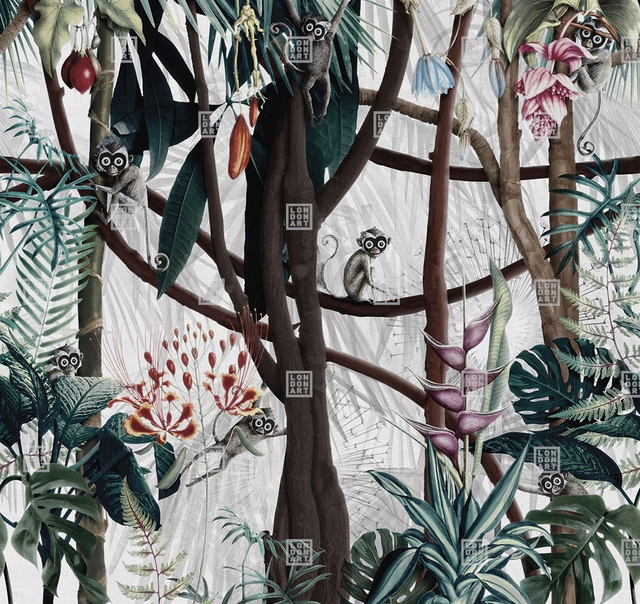 London Art 18053-04 22 Iconic Re-edition Looks in the Forest - tropikalny mural z motywem drzew kakaowca i małpek