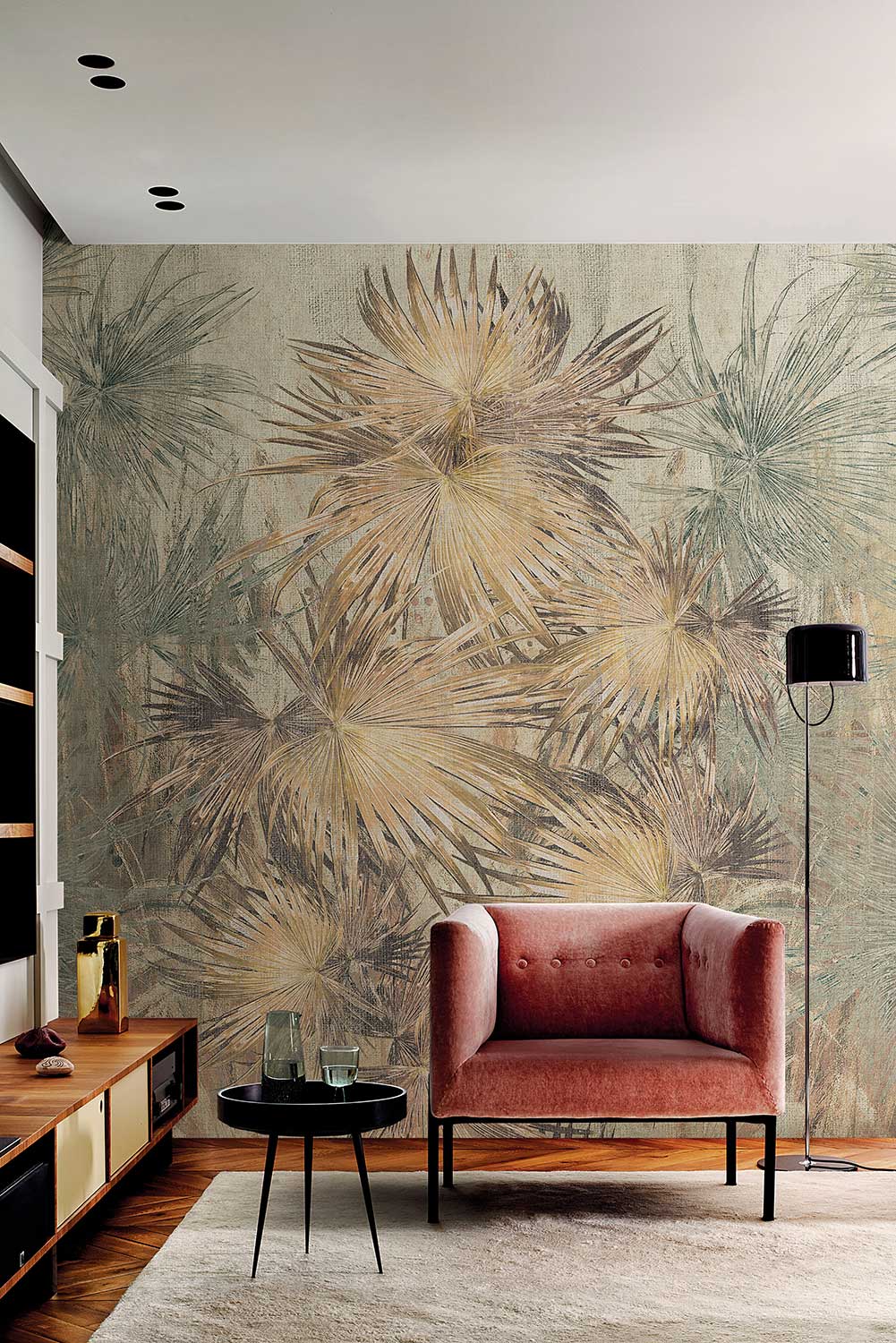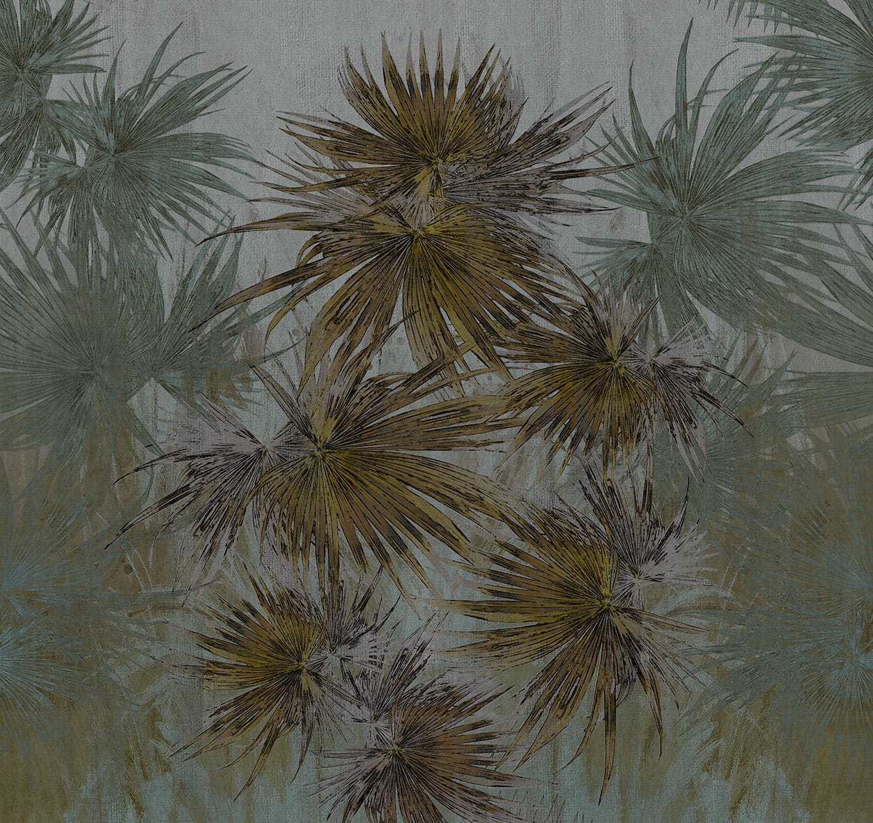Mural London Art Exclusive 19 19073-03 Just Breathe przedstawia szerokie, mocno rozłożone, sztywne łodygi liście połączone kępkami w górnej części kompozycji. Wyróżniającym się elementem projektu są liście palmy, których końce są zwykle zielone na górze i srebrzyste na dole. W tej kompozycji zabarwione są ciepłymi odcieniami żółci i szarości doskonale dopasowując się zarówno do stylu klasycznego, jak i nowoczesnego we wnętrzu. Mural London Art Exclusive 19 19073-03 Just Breathe dostępny jest w trzech wersjach kolorystycznych.